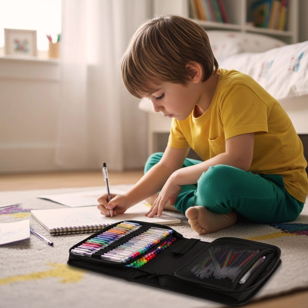 Išskleidžiamas dėklas su elastiniais laikikliais laiko rašiklius tvarkingai surikiuotus ir apsaugotus. Lengvai pasiimsite juos bet kur su savimi.