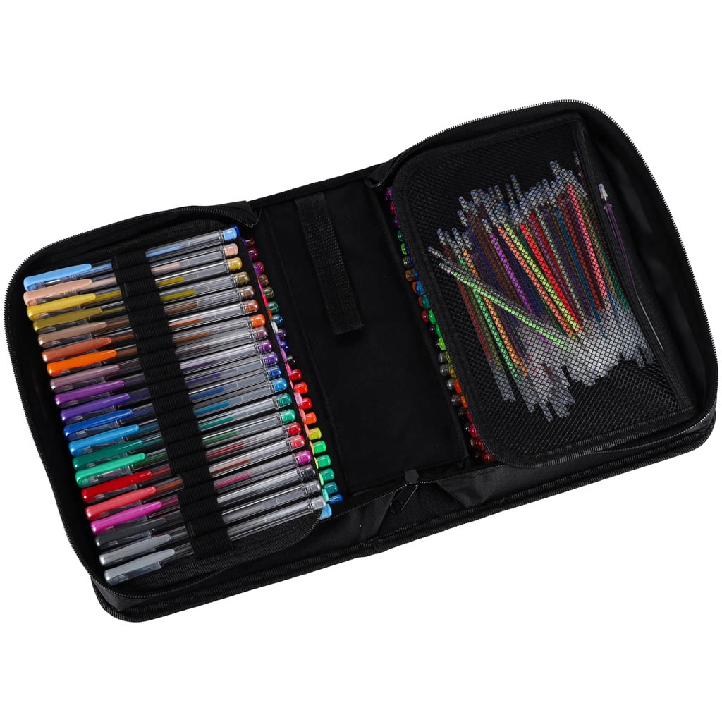 Atraskite universalų rinkinį mokyklai, biurui ir laisvalaikiui: 100 gelinių rašiklių plačioje spalvų ir efektų paletėje, be to, su 100 atsarginių šerdelių. Tvarkingas išskleidžiamas dėklas su užtrauktuku laiko kiekvieną rašiklį savo vietoje, tad visos spalvos visada po ranka ir saugiai sudėtos.