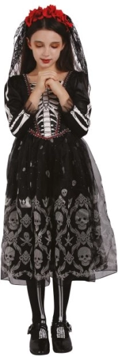 Stilingas vaikiškas skeletų motyvo kostiumas, skirtas 10–12 metų amžiui, idealiai tinka karnavalui, Helovinui ir Día de los Muertos šventėms. Rinkinyje yra gėlėta lankelė su nuometu ir patogi suknelė iš 100% poliesterio. Puikus pasirinkimas išraiškingam persirengimui, kuris traukia akį ir kartu lengvai apsivelkamas.