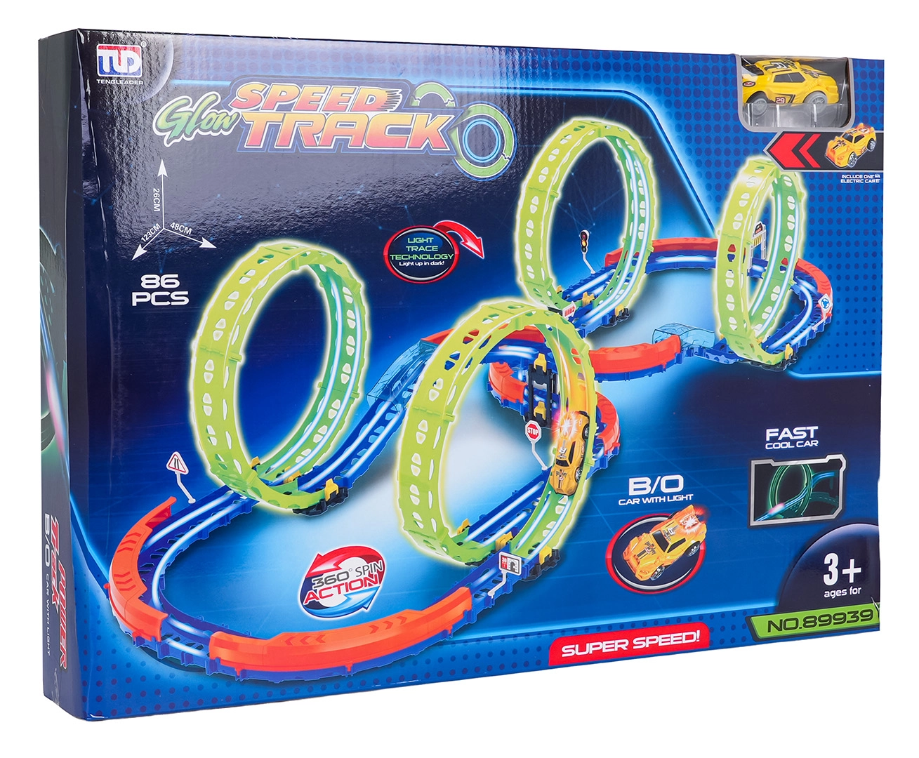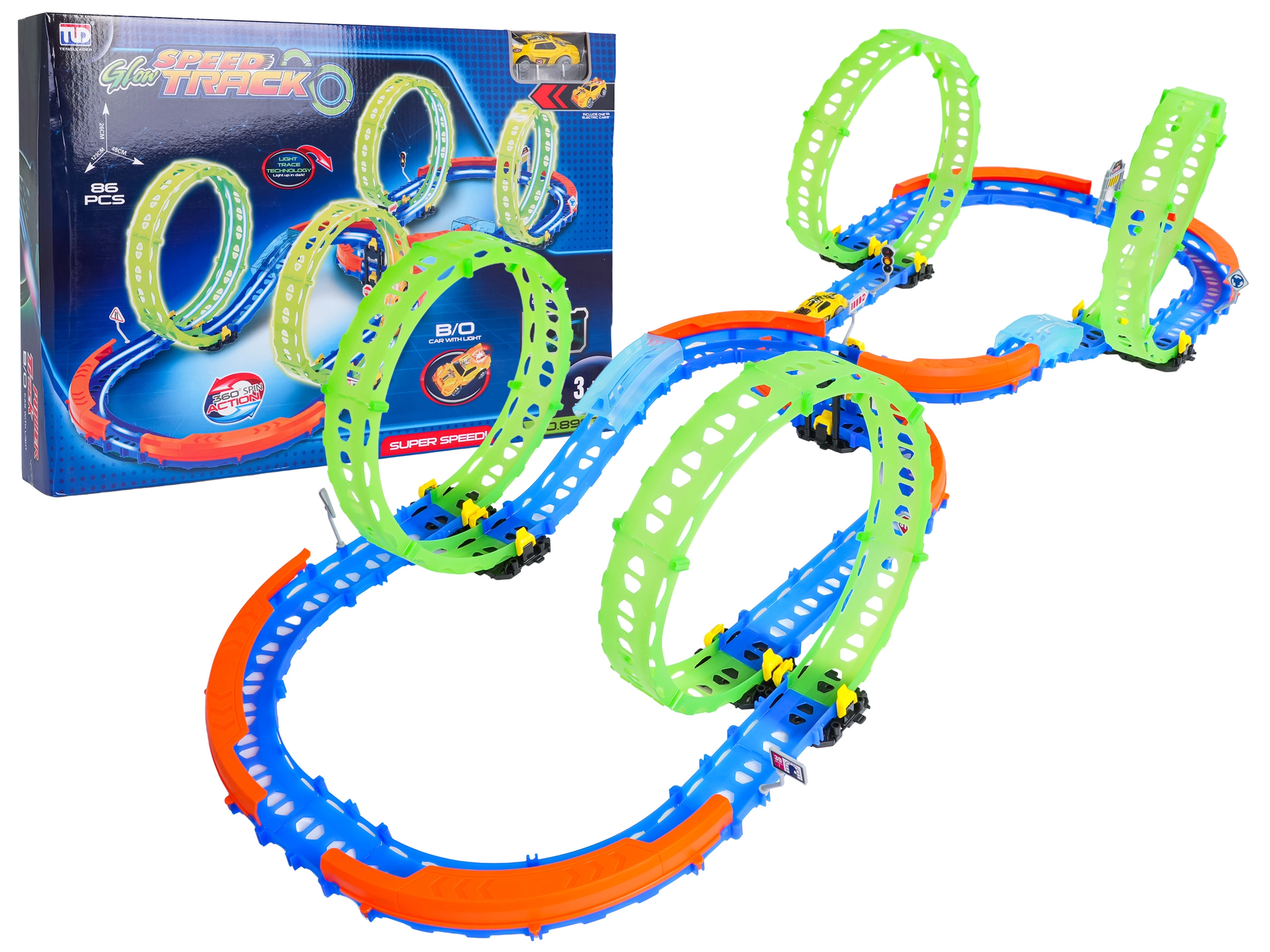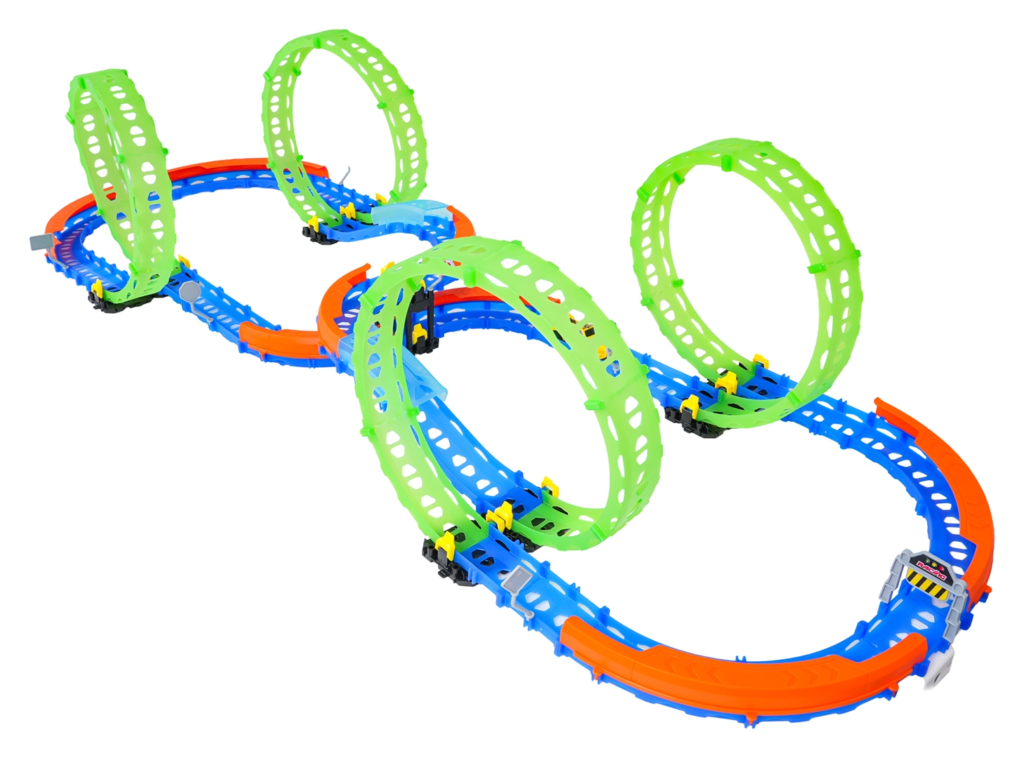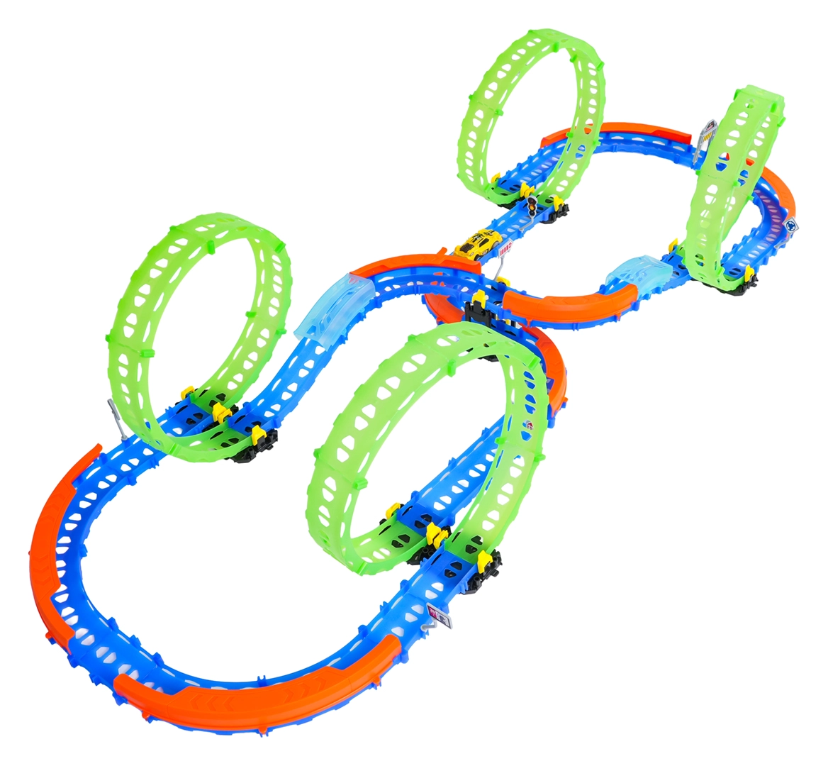 Ši spalvinga lenktynių trasa siūlo puikius akrobatinius važiavimus ir kūrybišką konstravimą. Dėl fluorescencinių kilpų ir automobilio šviesos efekto ji ypač išryškėja tamsoje, kur virsta ryškia trasa, kupina įtampos. Tvirti turėklai posūkiuose padeda išlaikyti automobilį saugiai kelyje.