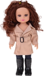 Elegantiškas smėlio spalvos trenciukas su dirželiu, tamprės ir juodi bateliai pabrėžia lėlės madingą įvaizdį ir įkvepia kūrybingam perrengimui.
