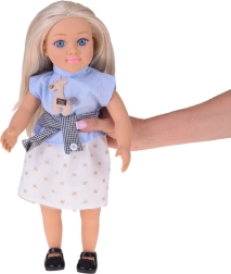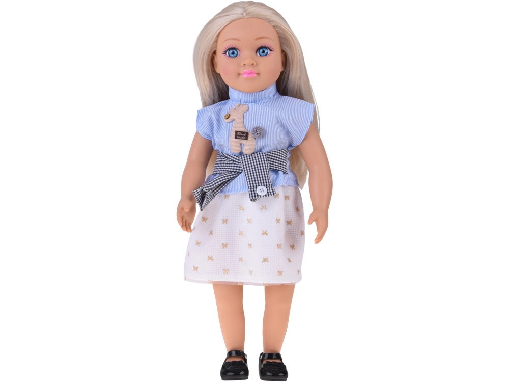 Lėlė aprengta elegantiška kombinacija – mėlynas dryžuotas topas su aplikacija, stilingas dirželis ir kreminis sijonas su auksiniais motyvais sudaro harmoningą aprangą, papildytą juodais balerinos tipo bateliais. Dėl judančių rankų, kojų ir galvos lėlę lengva pasodinti ir sustatyti į įvairias pozas scenoms bei istorijoms kurti.