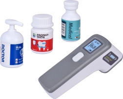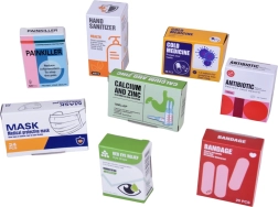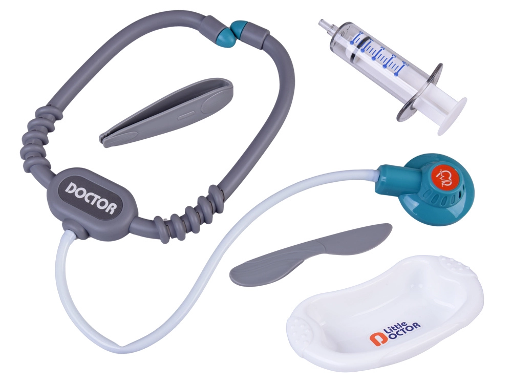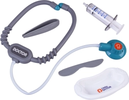 - Stetoskopas su garsu, elektroninis termometras, švirkštas, žirklutės, pincetai, otoskopas, plaktukas, veidrodėlis, dubenėlis, lašinė, „tablečių“ lizdinė plokštelė, „vaistų“ dėžutės ir buteliukai