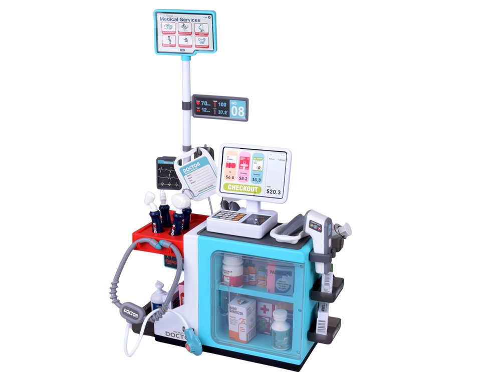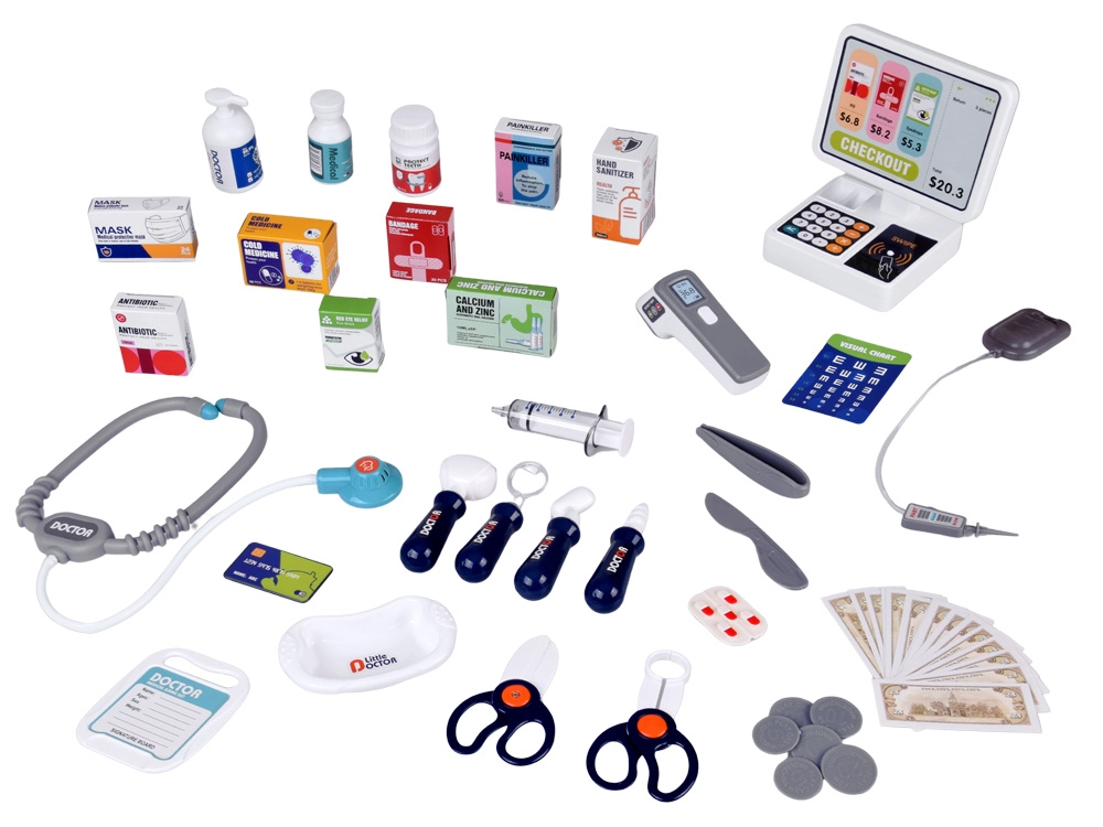Komplekte yra kasa su terminalu (atsiskaitymas kortele ir „grynaisiais“), stetoskopas su širdies plakimo garsu, elektroninis termometras bei daugybė medicininių įrankių ir „vaistų“ dėžučių. Rinkinys lavina komunikaciją, smulkiąją motoriką ir pagrindinį finansinį raštingumą.