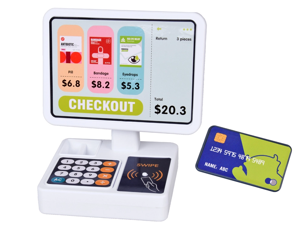 Vaikai pasipraktikuos atsiskaityti kortele ir grynaisiais. Ekranas, mygtukai ir kortelių skaitytuvas su garsais suteikia žaidimui realistiškumo ir įdomios edukacijos.