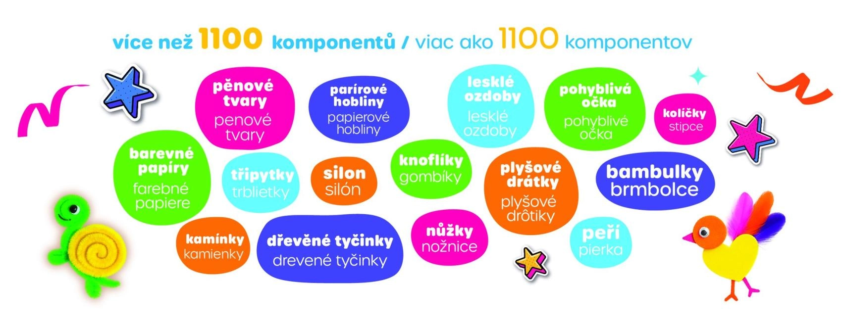 Šis spalvingas kūrybinis rinkinys skatina vaikų fantaziją ir smulkiąją motoriką. Dėl gausios komponentų įvairovės – tokių kaip pūkuotos vielutės, pomponai, putplasčio formos, karoliukai, plunksnelės ir lipdukai – vaikai gali kurti tiek paprastus, tiek sudėtingesnius projektus pagal nuotaiką.