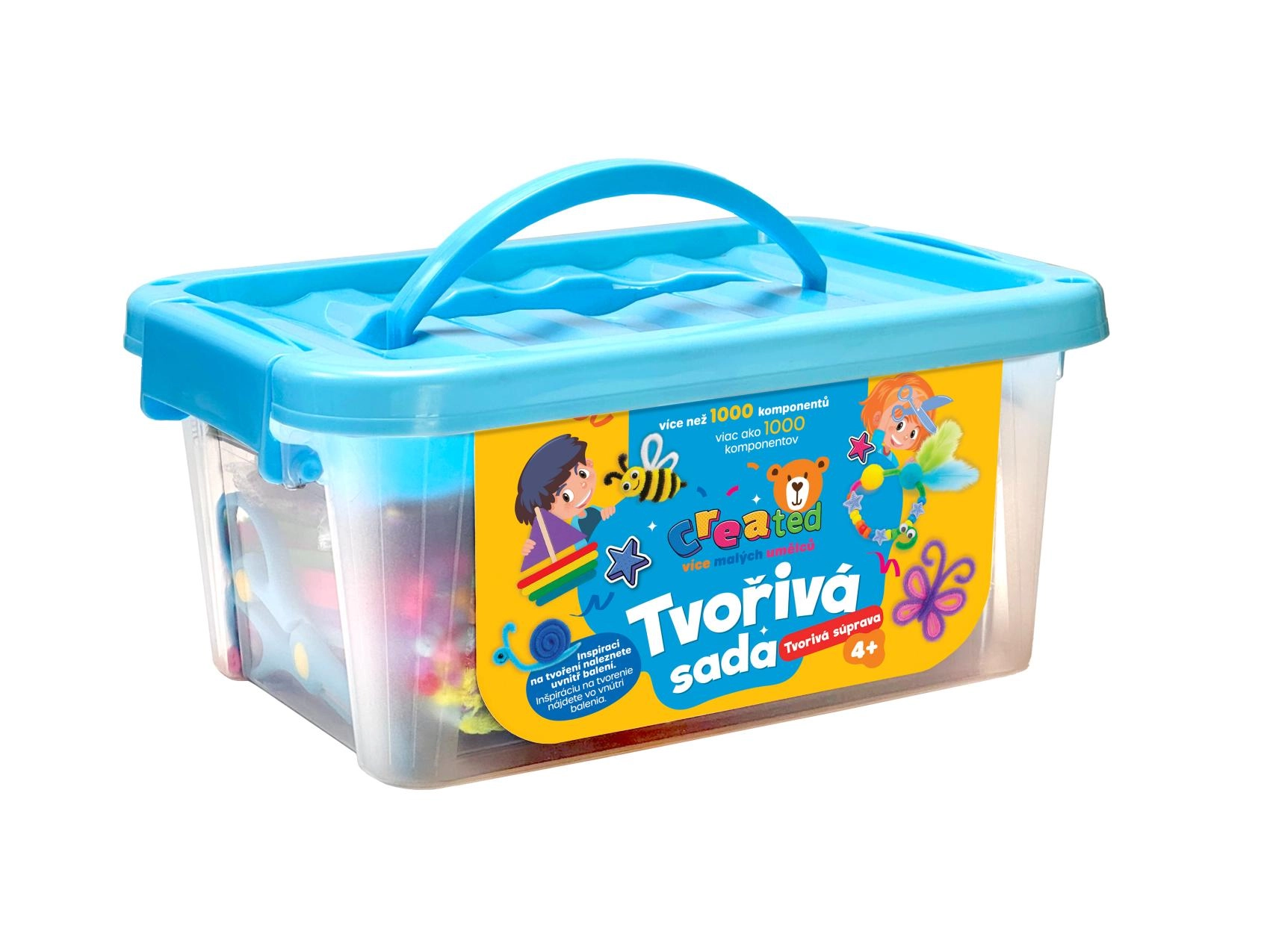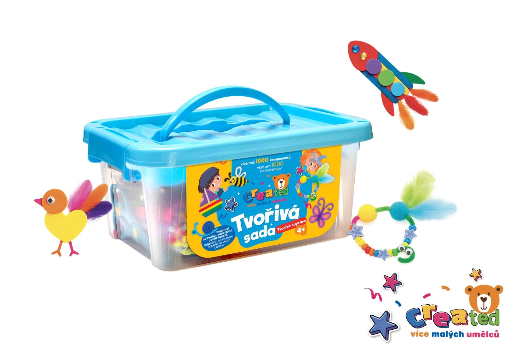 Tinka DIY projektams, kūrybinėms akimirkoms ir darbeliams su tėvais. Ryškūs putplasčio formelės, pūkuotos vielutės, pom–pom kamuoliukai, karoliukai ir lipdukai kviečia eksperimentuoti ir žaisti. Dėklas su rankena leidžia lengvai pernešti ir saugiai laikyti.