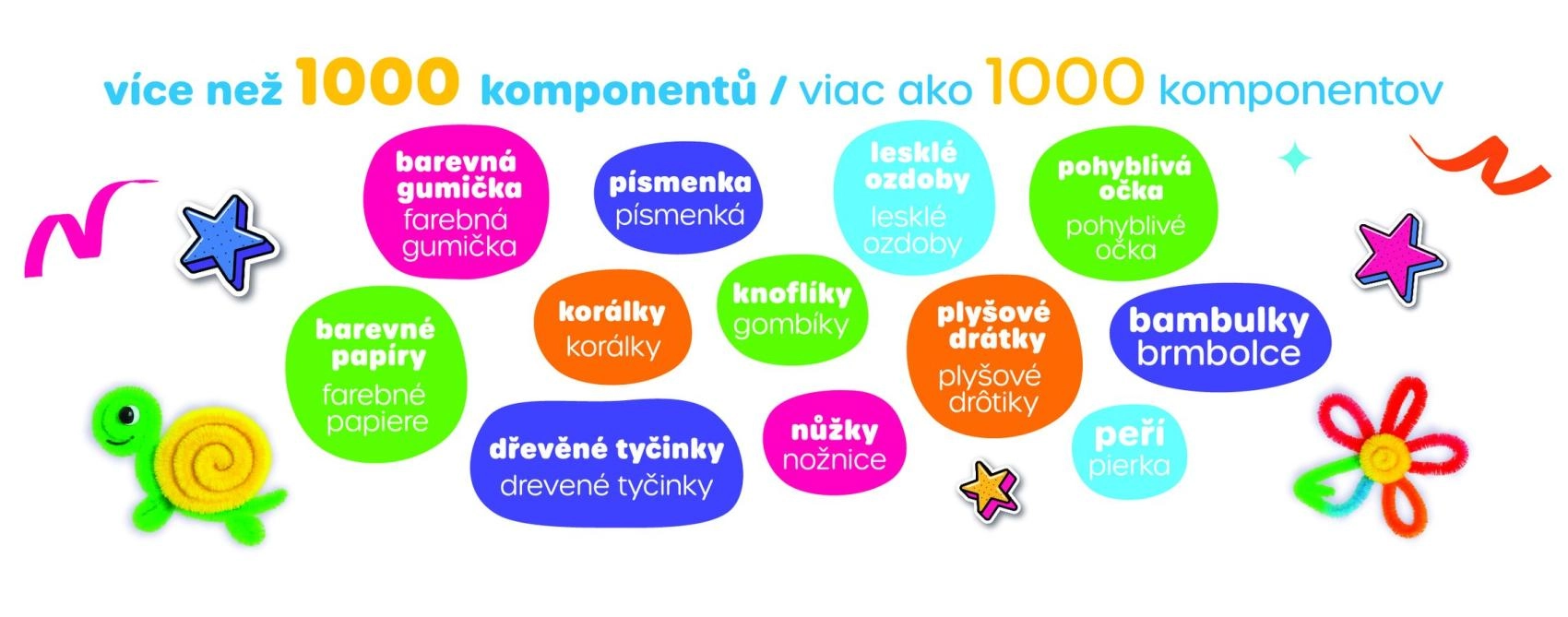 Šis turtingas rinkinys lavina vaikų fantaziją, smulkiąją motoriką ir kūrybiškumą. Dėl įvairių medžiagų vaikai pasigamins savo papuošimus, gyvūnėlius, gėles ar smulkias dekoracijas – namuose, darželyje ir kelionėse. Praktinis dėklas laiko visas dalis kartu ir pagreitina tvarkymą.