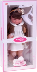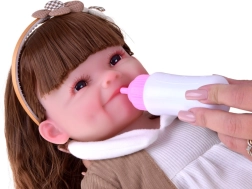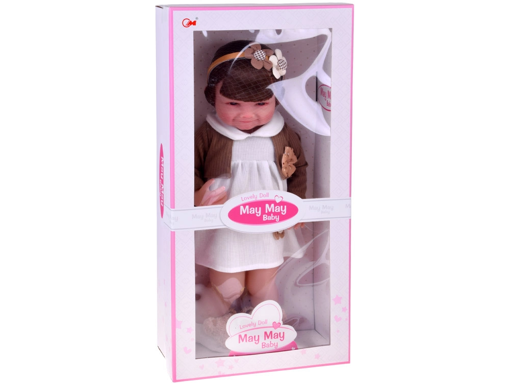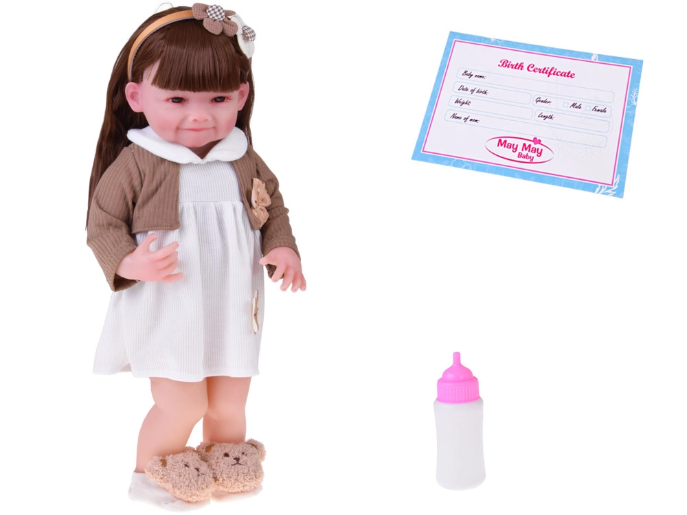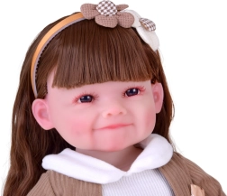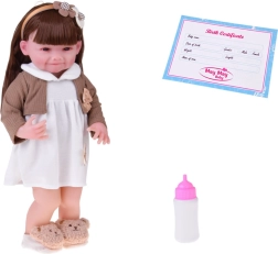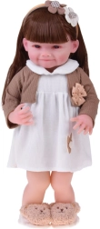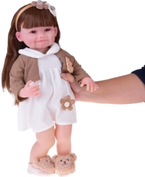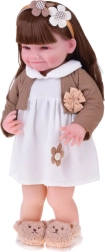Ši graži lėlė vilki baltą suknelę su gėlių aplikacija ir rudą megztuką su kaspinėliu. Įvaizdį papildo minkštos šlepetės meškučių formos ir smėlio spalvos lankelis su puošmena, kurie pabrėžia švelnią, vaikiškai saldžią išvaizdą. Dėl realistiško veido ir ilgų plaukų vaikai mėgausis valandomis kūrybiško žaidimo.