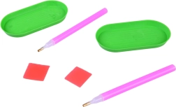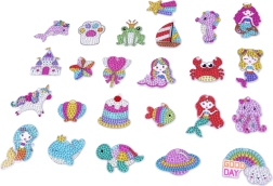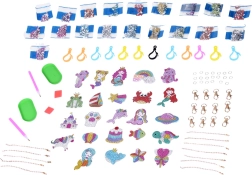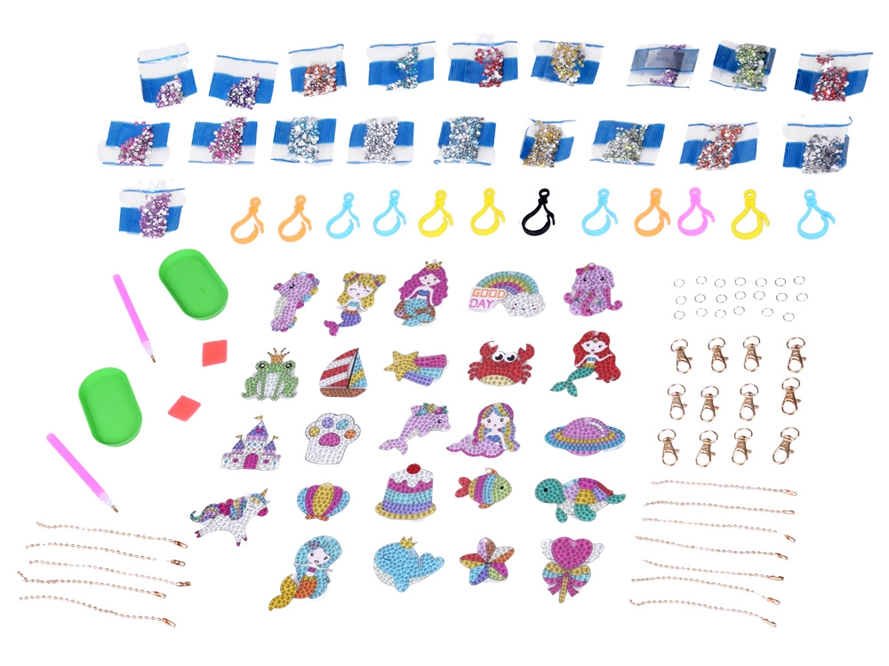 Rinkinyje rasite motyvus, tokius kaip jūrų undinės, delfinas, krabas, jūrų arkliukas, banginis su karūna, vaivorykštė, planeta, pilis, vienaragis, tortas, kačiuko pėdutė, kriauklė ir kt. Kiekvienas pakabukas turi iš anksto pažymėtas vietas akmenėliams, todėl vaikams lengva suprasti, kur jį uždėti. Tereikia suberti akmenėlius į indelį, paimti aplikatoriumi su vašku ir prispausti.