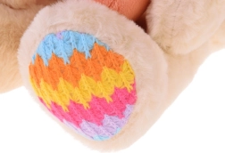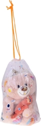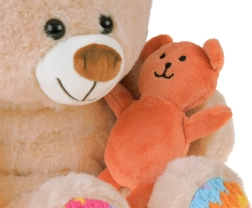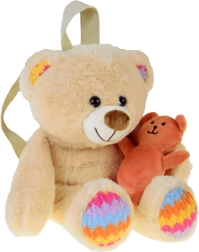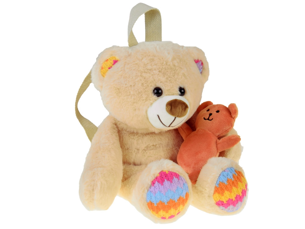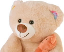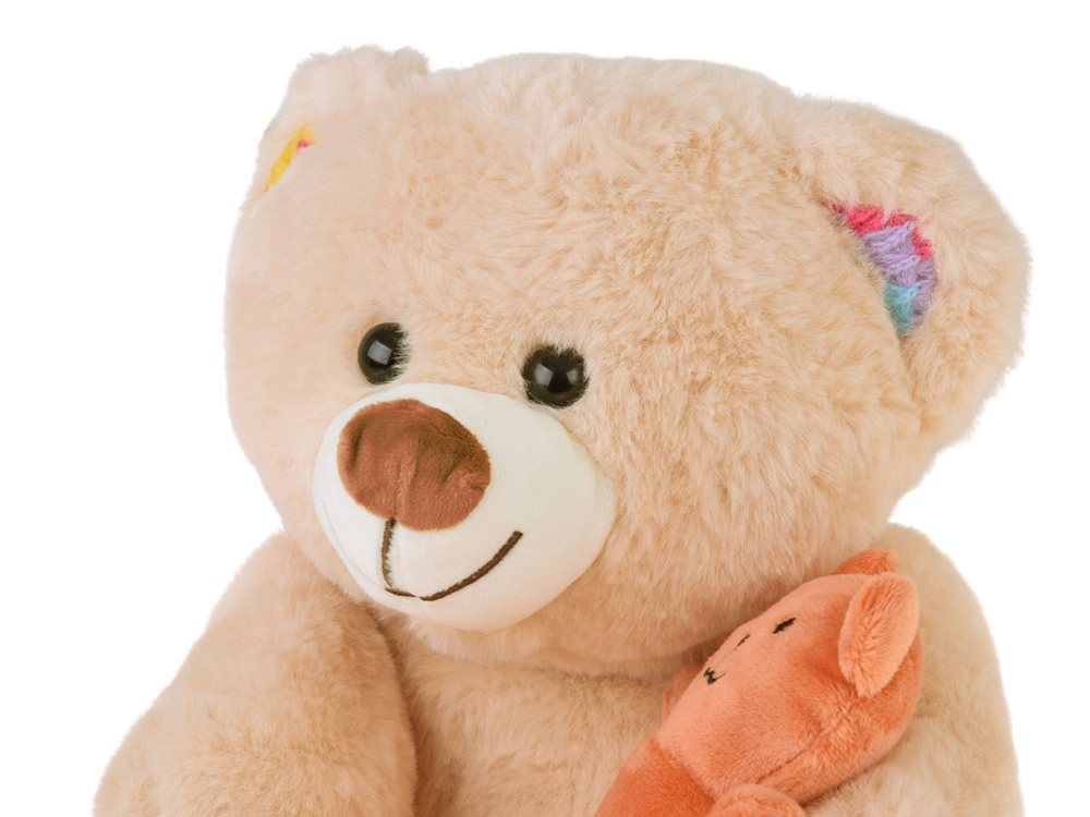 - Smėlio spalvos meškiukas su spalvotomis letenėlių ir ausyčių detalėmis, pridėtas mažas oranžinis meškiukas