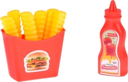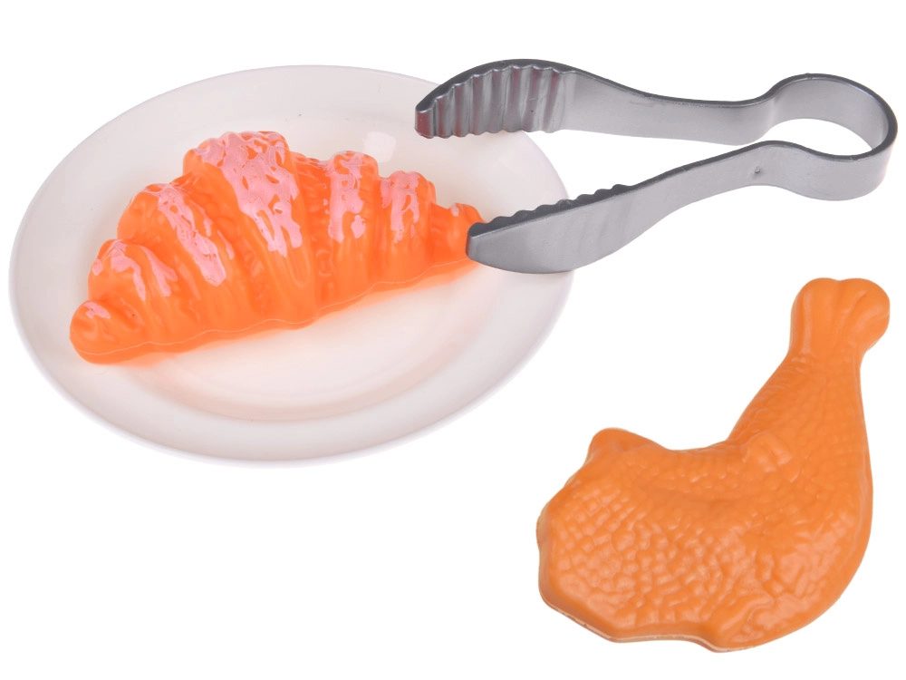 Komplekte gausūs priedai: padėklas su bulvytėmis, kečupas, vištos šlaunelė, kruasanas, žnyplės, lėkštė ir krepšelio grotelės. Vaikai gali saugiai „gaminti“, patiekti ir treniruoti socialinius vaidmenis namuose.