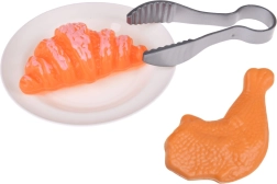 Lėkštė, žnyplės, grotelės krepšeliui, kruasanas, vištos šlaunelė, porcija bulvyčių su indeliu ir kečupo buteliukas skatins kūrybišką virėjo žaidimą.