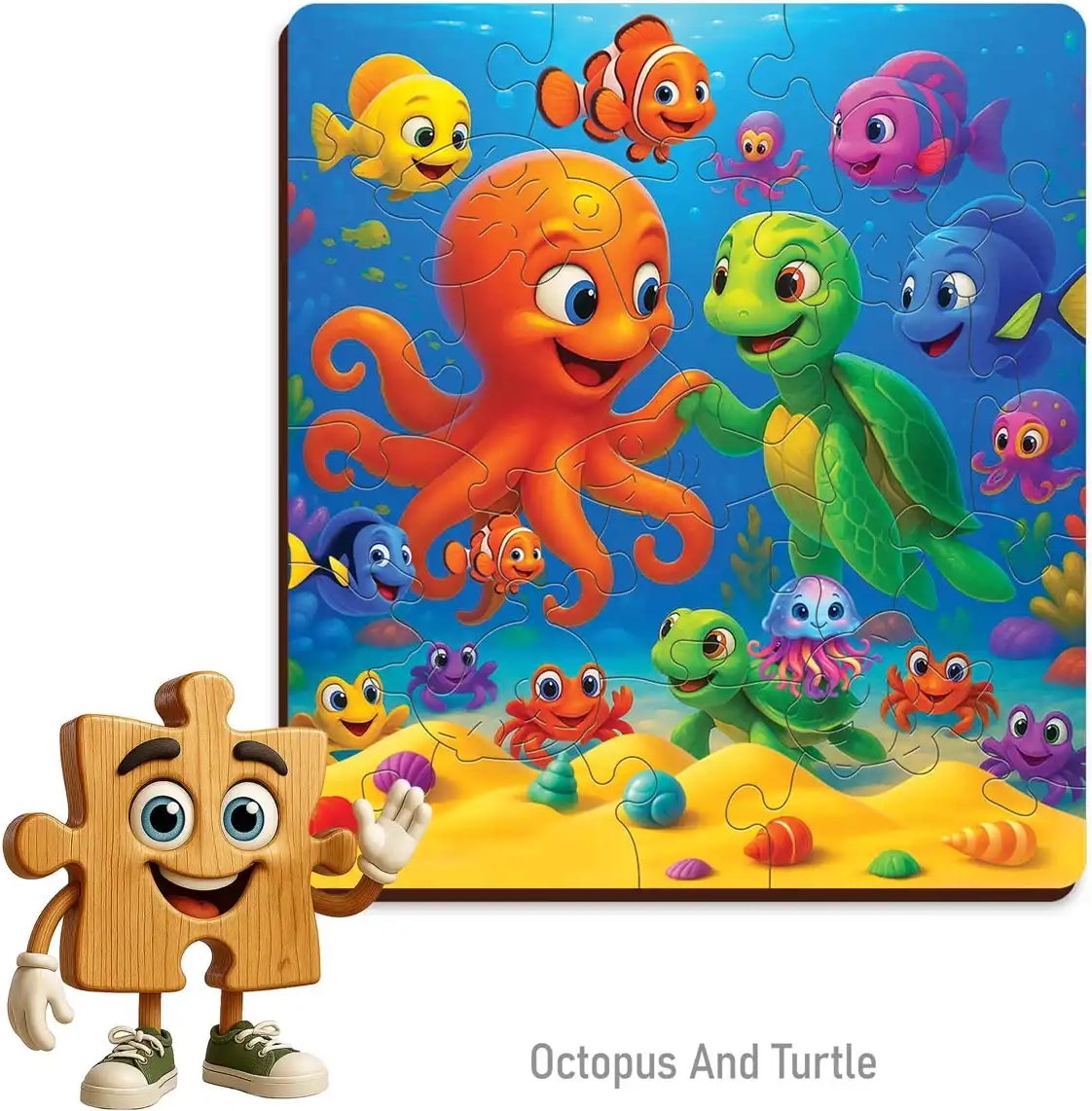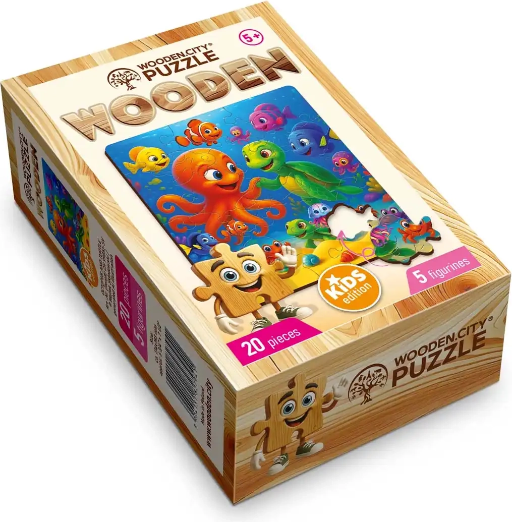 Medinės WOODEN CITY dėlionės su aštuonkojo ir vėžlio motyvu perkelia vaikus į kerintį povandeninį pasaulį. Kiekviena detalė pagaminta maksimaliai tiksliai, kad idealiai derėtų tarpusavyje, o galutinis vaizdas būtų apie 19,3 × 17,4 cm.