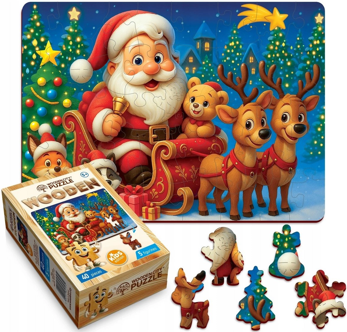 Atraškite Kalėdų magiją su medine WOODEN CITY dėlione – idealiai tinkančia mažiesiems statytojams. Rinkinyje yra 40 tvirtų medinių dalių, įskaitant 5 unikaliai suformuotas figūrėles, kurios lavina sutelktą dėmesį, kantrybę ir kūrybiškumą. Dėl preciziško lazerinio pjovimo dalys turi lygias, be atplaišų briaunas, o dėlionė kuria žavią šventinę sceną su KALĖDŲ SENELIU. Pakuotėje yra atskiras pavyzdys lengvesniam dėliojimui.