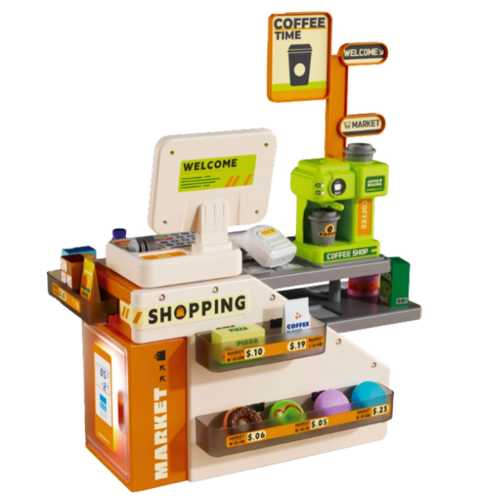 Spalvingas vaikų kasos aparatas su integruota kavine siūlo pilną mažojo pardavėjo darbo vietą. Įrengtas veikiančiu skeneriu, didele vandens kavavire, atidaroma prekystale ir šaldytuvu, taip pat gausia priedų komplektacija. Realistiški šviesos ir garso efektai skatina vaizduotę, lavina skaičiavimą, koordinacijos įgūdžius ir vaidmenų žaidimą.