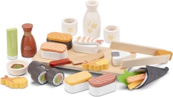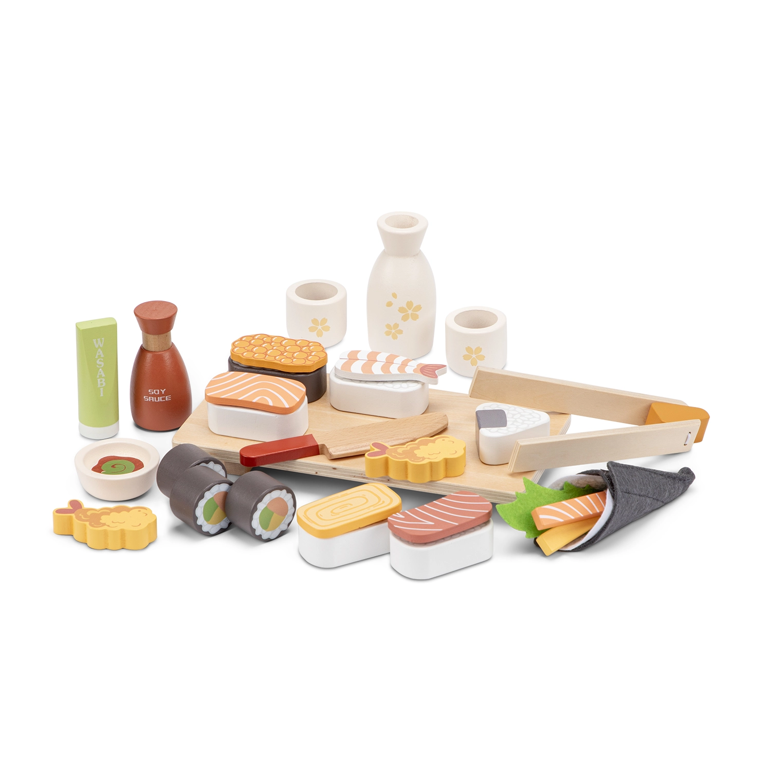 Šis gausiai sukomplektuotas rinkinys leidžia vaikams paruošti savo „puotą“ – nuo nigiri ir suktinukų iki vasabi ir sojų padažo. Komplekte yra serviravimo padėklas, lazdelės su vaikišku laikikliu, peilis, dubenėlis, žnyplės/lazdelės ir net sakės buteliukas su puodeliais. Kiekviena detalė kruopščiai nudažyta, kad atrodytų kuo realesnė.