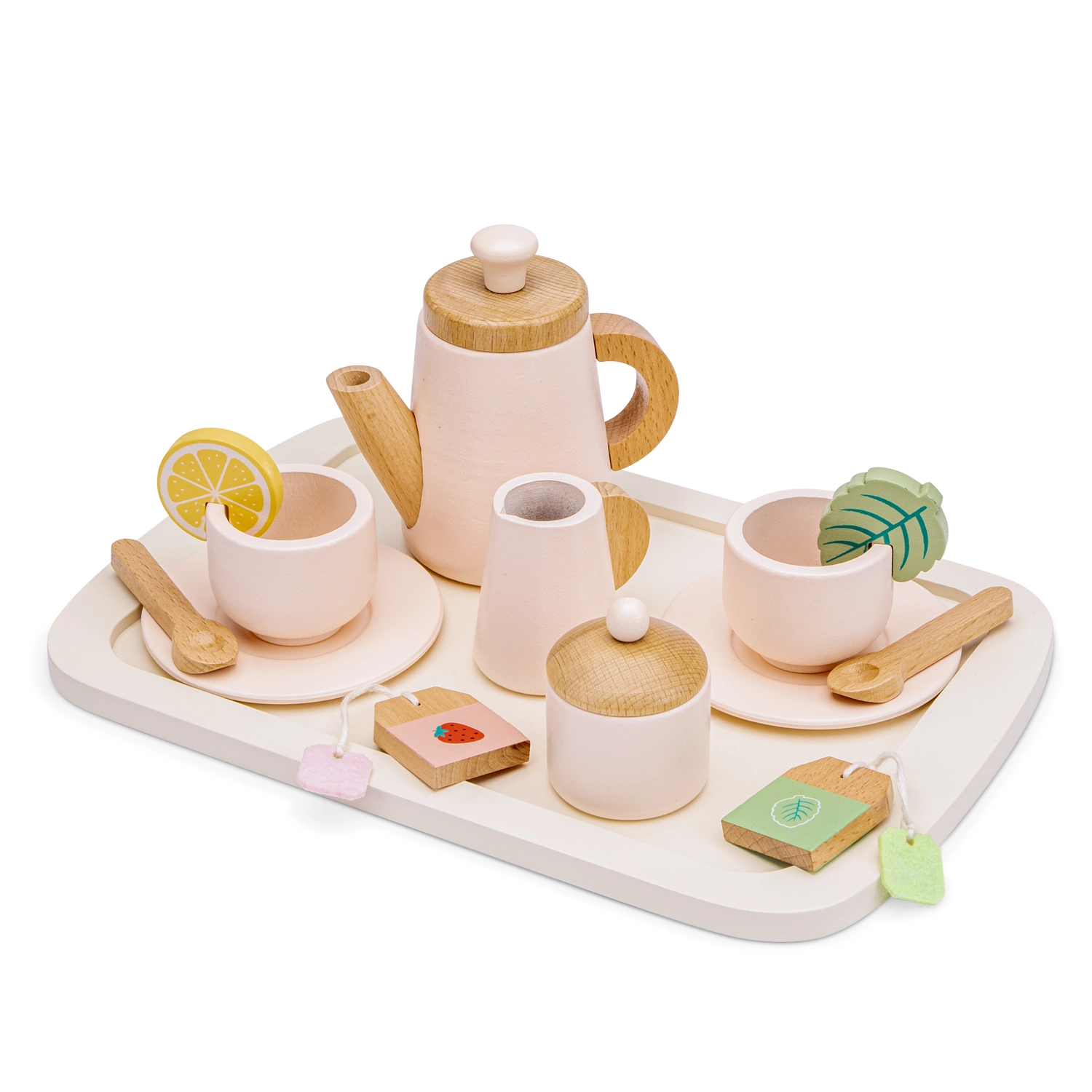 Pakvieskite pliušinius žaislus ir draugus į stilingą arbatėlę su gražiu mediniu rinkiniu vaikams nuo 2 metų. Rinkinyje yra arbatinukas su dangteliu, 2 puodeliai su lėkštutėmis, pieno ąsotėlis, cukrinė, šaukšteliai, arbatos pakeliai, citrinos riekelė, mėtos lapelis ir erdvus padėklas. Skatina smulkiąją motoriką, vaizduotę ir socialinį žaidimą, o natūralaus medžio ir švelnių spalvų derinys puikiai įsilieja į vaikų kambarį.