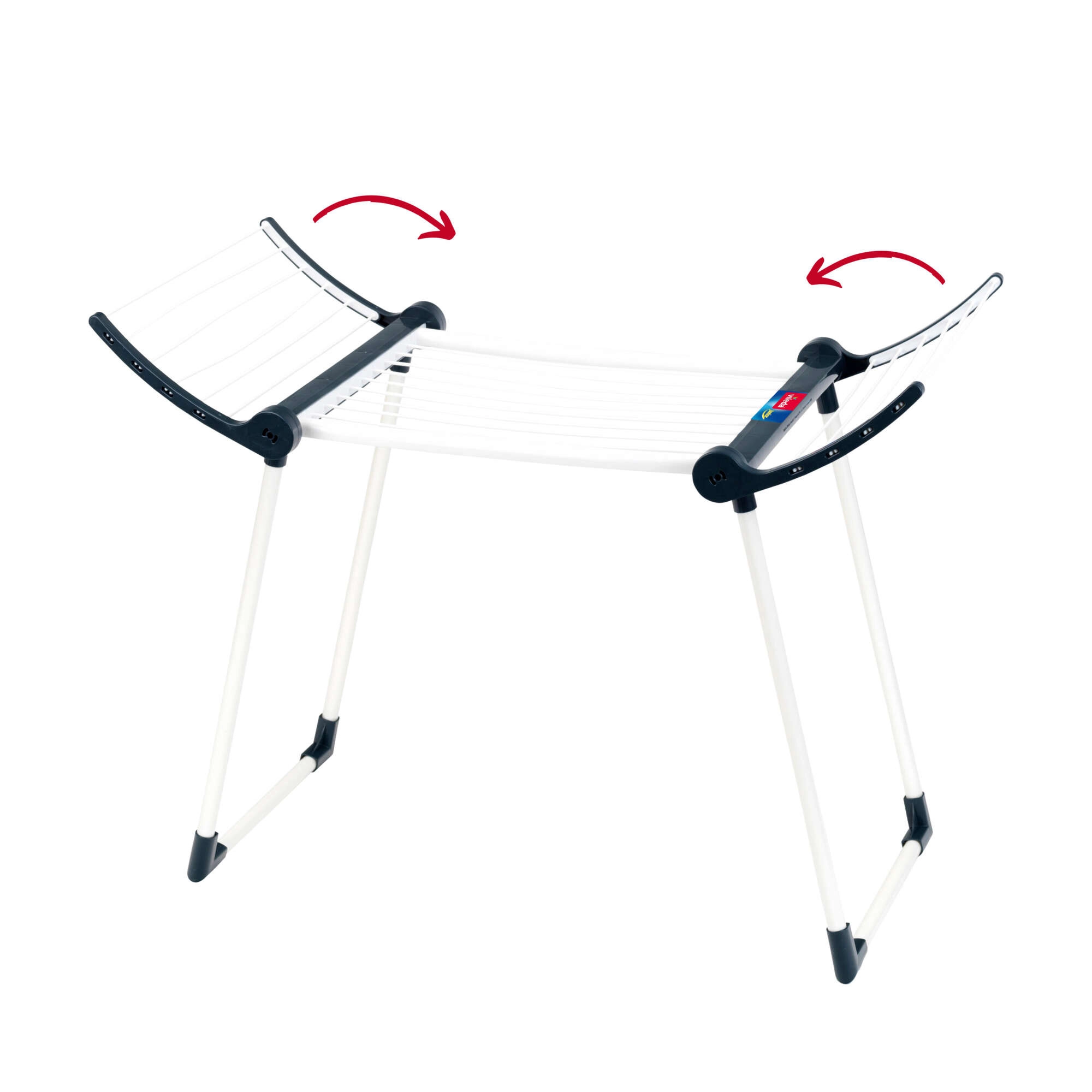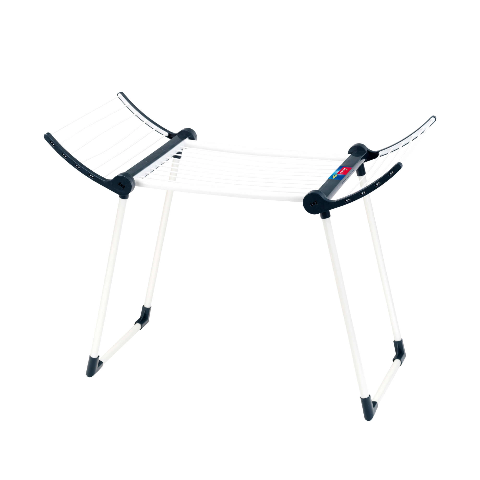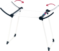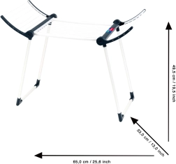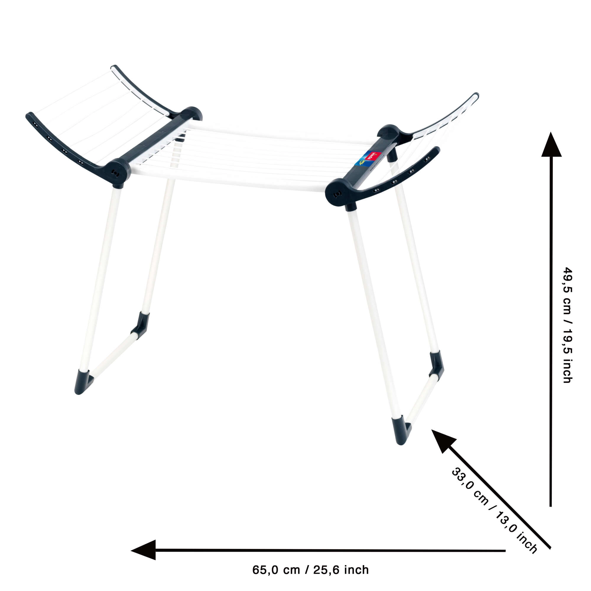 Konstrukcija tvirta ir stabili dėl dvigubų kojelių, džiovyklė baltos spalvos su juodais elementais ir turi du nulenkiamus šonus, kad būtų daugiau džiovinimo vietos. Po žaidimo ją lengvai sulankstysite iki kompaktiškų matmenų, todėl taupo vietą vaikų kambaryje.