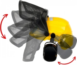 - Saugos priedai – reguliuojamas šalmas su atverčiamu apsauginiu skydeliu ir klausos apsaugomis.