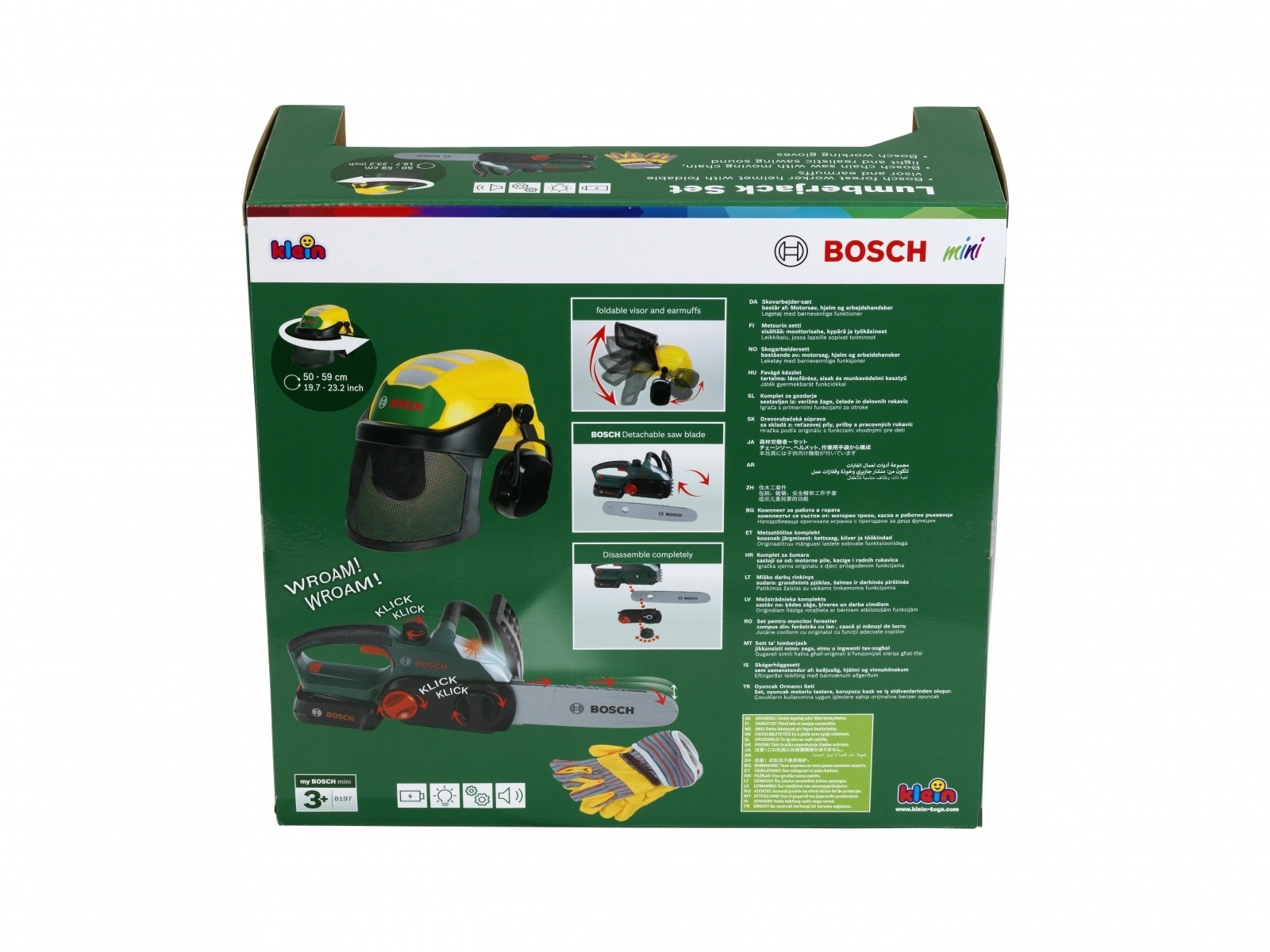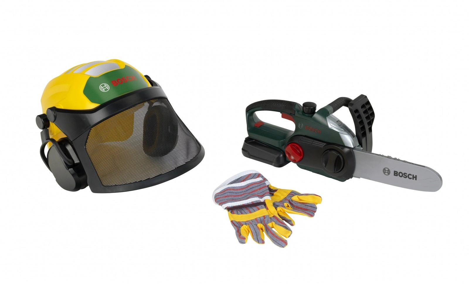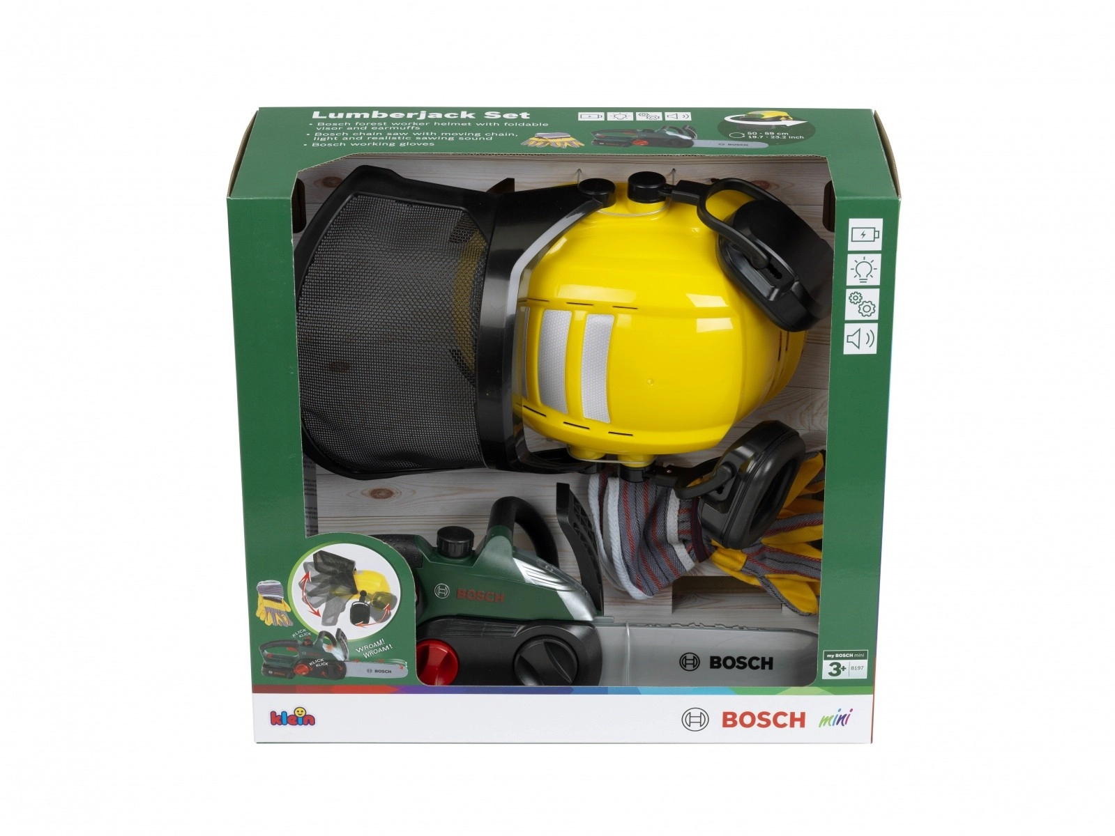 Vaikiškas BOSCH medkirčio rinkinys sukurtas saugiam ir ugdančiam žaidimui. Elektroninis grandininis pjūklas uždėjus juostą skleidžia autentišką pjovimo garsą ir lydi mirksinti šviesa, kuri imituoja tikro įrankio darbą. Reguliuojamas šalmas su skydeliu ir integruotomis „ausinėmis“ suteikia dar daugiau realistiškumo ir moko vaikus saugos pagrindų.