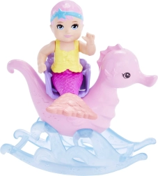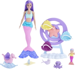 Atraskite kerintį povandeninį pasaulį su žaidimų rinkiniu Barbė undinėlė su kūdikiu. Pagrindinė lėlė su levandų spalvos plaukais ir rožiniu–mėlynu uodegos peleku rūpinasi žaviu jūros kūdikiu ir jūros draugais. Rinkinyje yra besisukantis karuselės gultukas, supamasis jūros arkliukas, buteliukas ir minkštas užklotėlis begaliniams fantazijos kupiniems nuotykiams.
