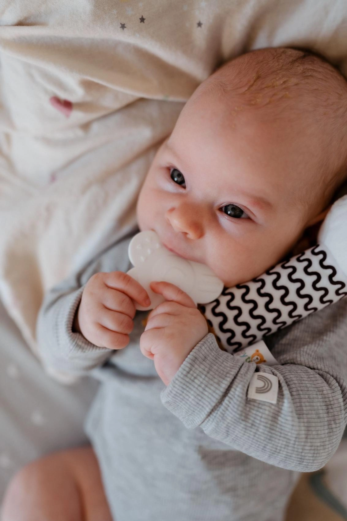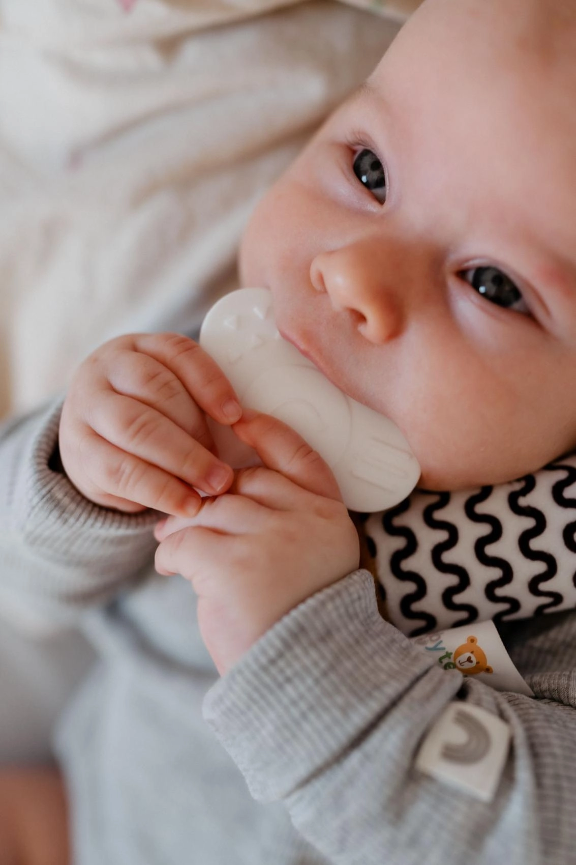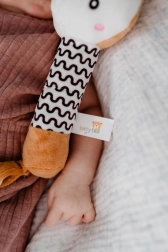 Ilgas ir minkštas korpusas patogiai telpa mažose rankytėse, o juodai baltas raštas skatina kūdikių vizualinį suvokimą.