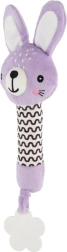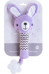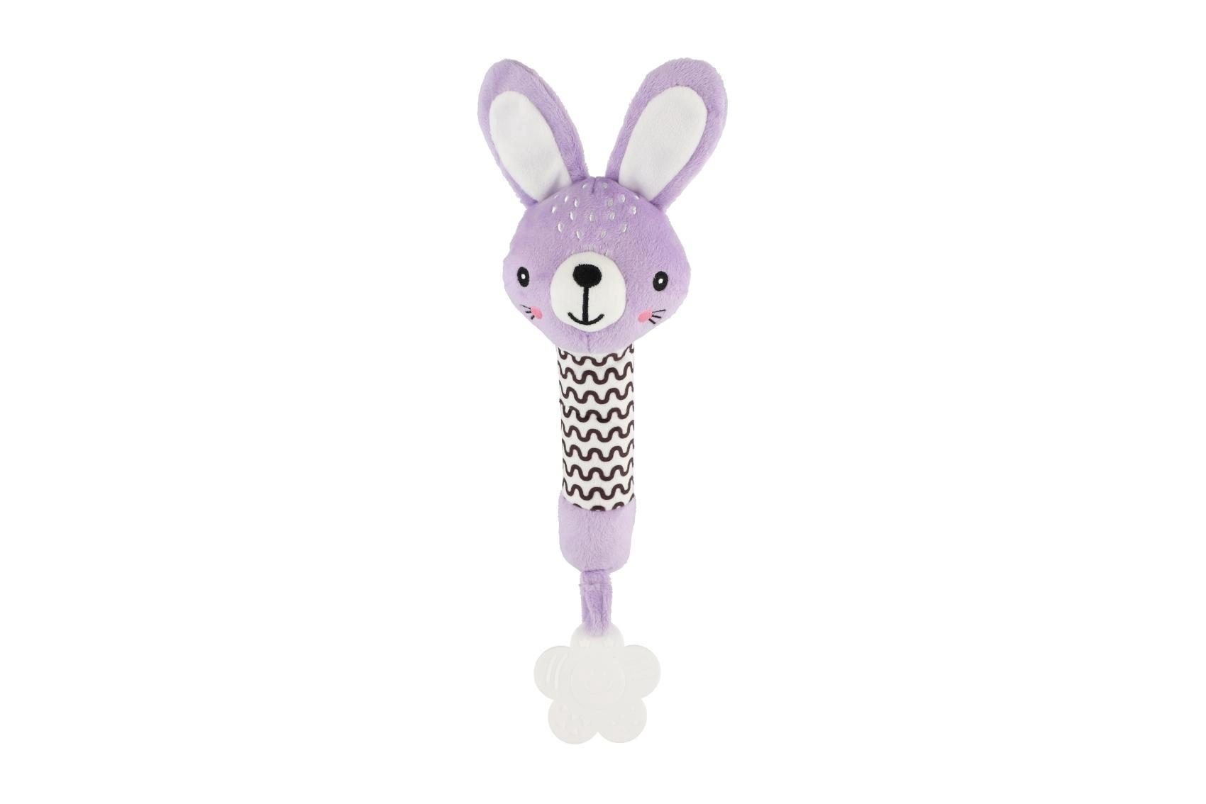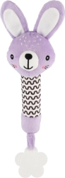 Violetinis pliušinis triušiukas – idealiausias pirmasis žaislas naujagimiui. Lengva konstrukcija ir ilgas minkštas korpusas puikiai telpa mažose rankytėse, paspaudus skleidžia švelnų cypsintį garsą, kuris natūraliai patraukia kūdikio dėmesį ir padeda suvokti garsus.