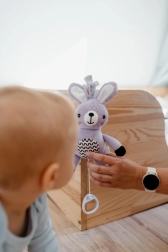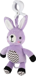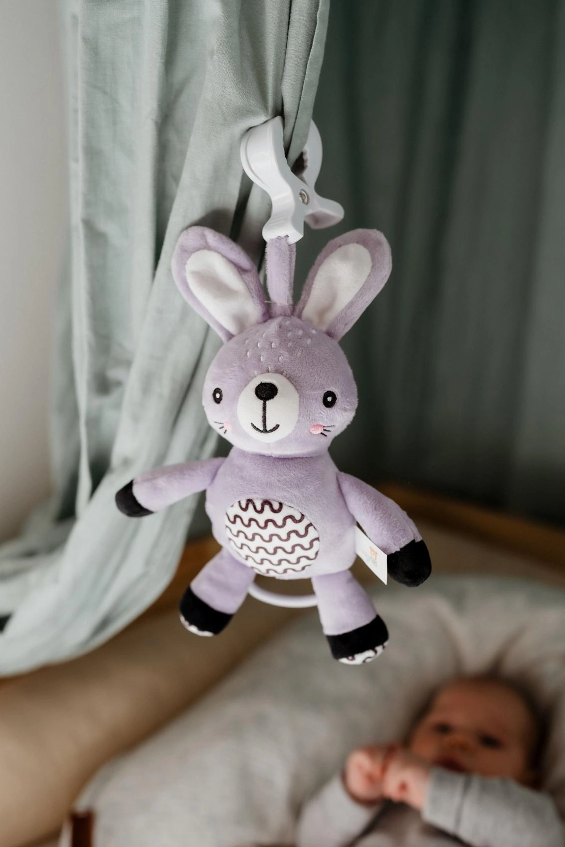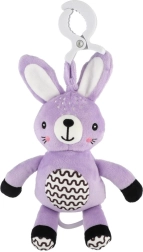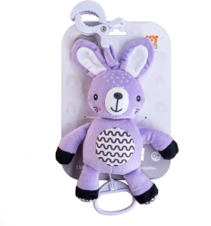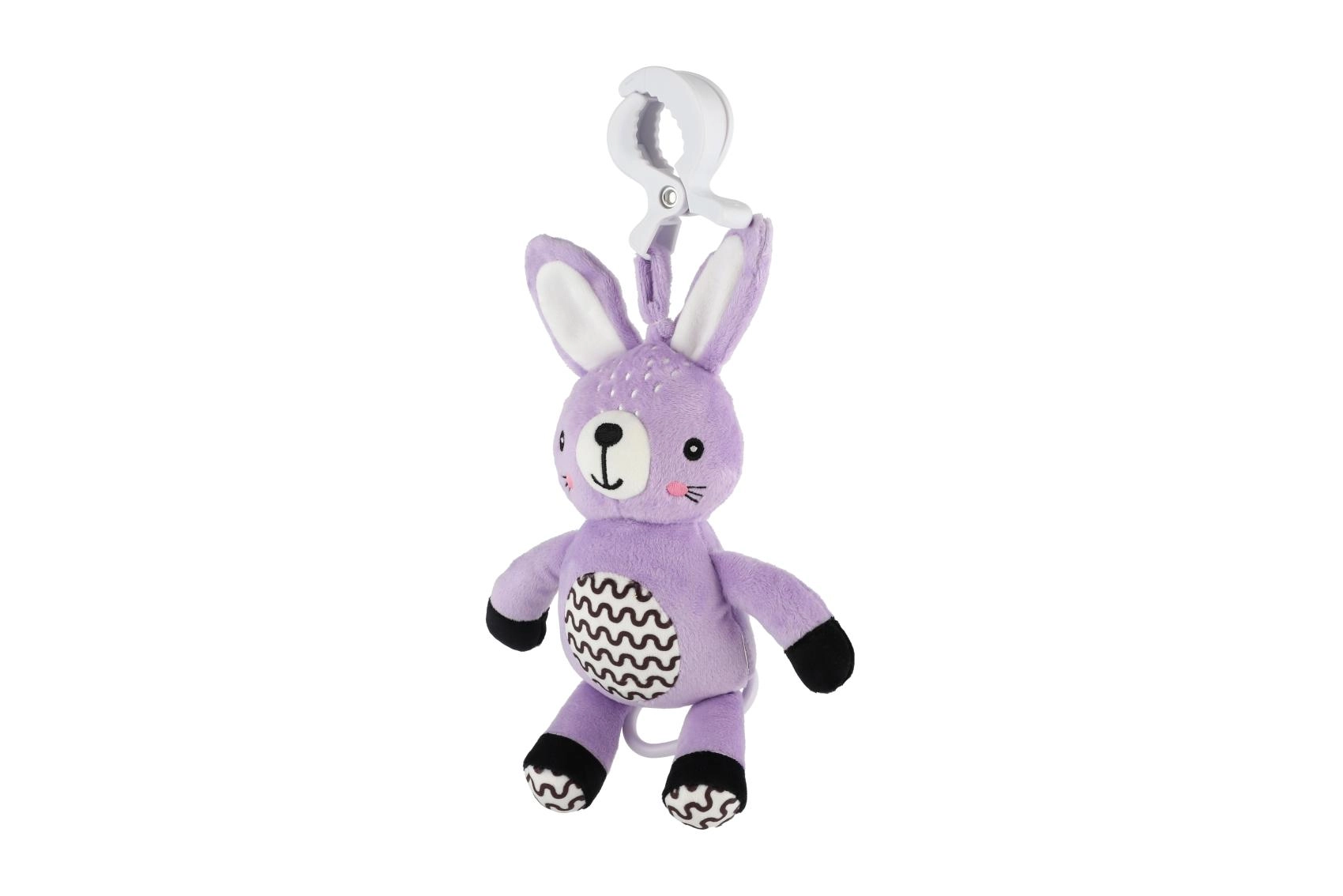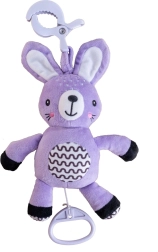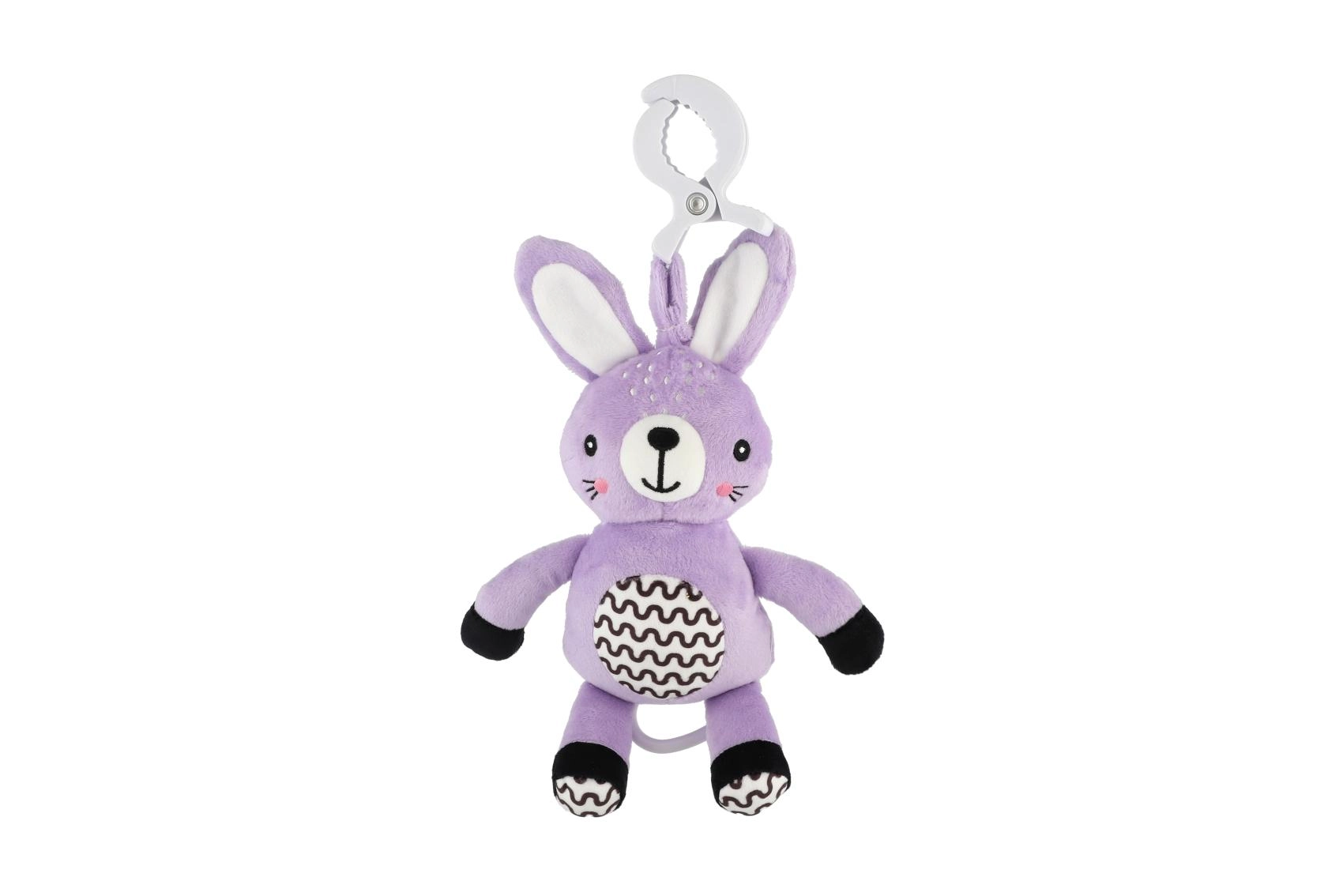 Šis kabinamas pliušinis zuikutis suteikia kūdikiui jaukumo, švelnią stimuliaciją ir saugų žaidimą namuose bei kelionėse. Užsukamas mechanizmas patraukus groja malonią melodiją, kuri padeda sukurti ramią aplinką poilsiui. Dėl universalaus segtuko žaislą lengvai pritvirtinsite prie vežimėlio, lovytės, automobilinės kėdutės ar žaidimų lankelio.