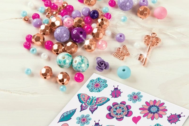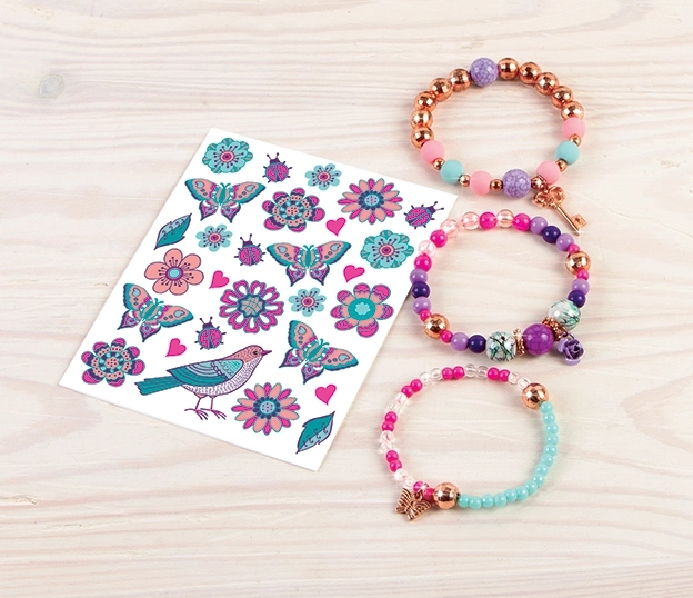 Lavink kūrybiškumą ir susikurk savo gėlėtas apyrankes, kurias suderinsi su laikinosiomis tatuiruotėmis. Dėl spalvingų karoliukų, pakabukų ir paprasto vėrimo per akimirką sukursi papuošalus, kurie pradžiugins kiekvieną mažą puošeivą.