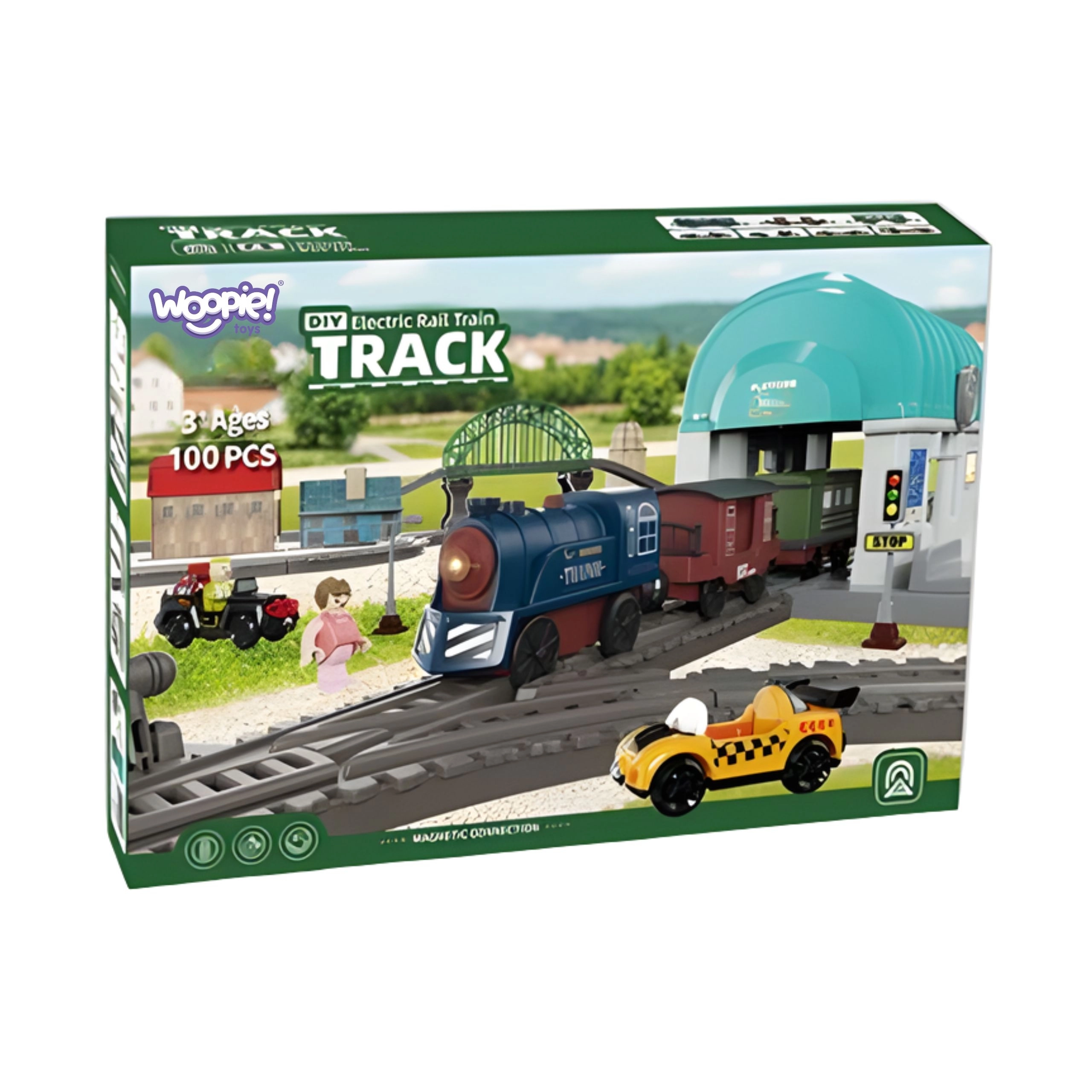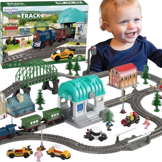 Plačią elektrinę traukinių trasą iš WOOPIE vaikai pamils dėl fantazijos pasaulio su miesteliu, tiltu, tuneliu ir stotimi. Lokomotyvas su šviesomis ir garsais, magnetinis vagonų sujungimas ir 108 dalys įvairioms trasoms kurti užtikrins ilgas pramogų valandas ir kūrybiškumo lavinimą. Lengvas surinkimas, saugios medžiagos ir maitinimas baterijomis pradžiugins tiek vaikus, tiek tėvus.