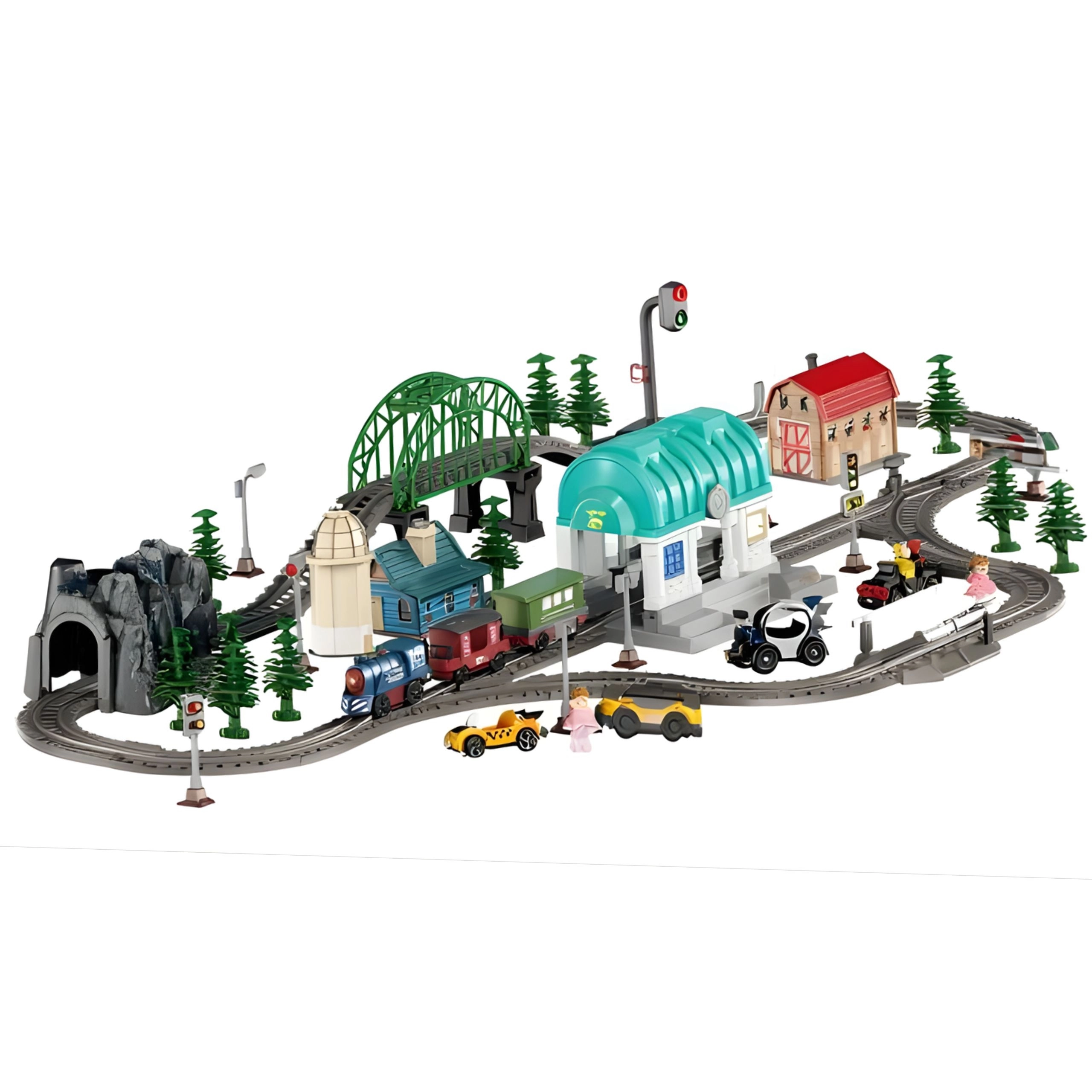 - 108 dalys, įskaitant bėgius, tiltą, tunelį, stotį, mašinėles, figūrėles ir priedus