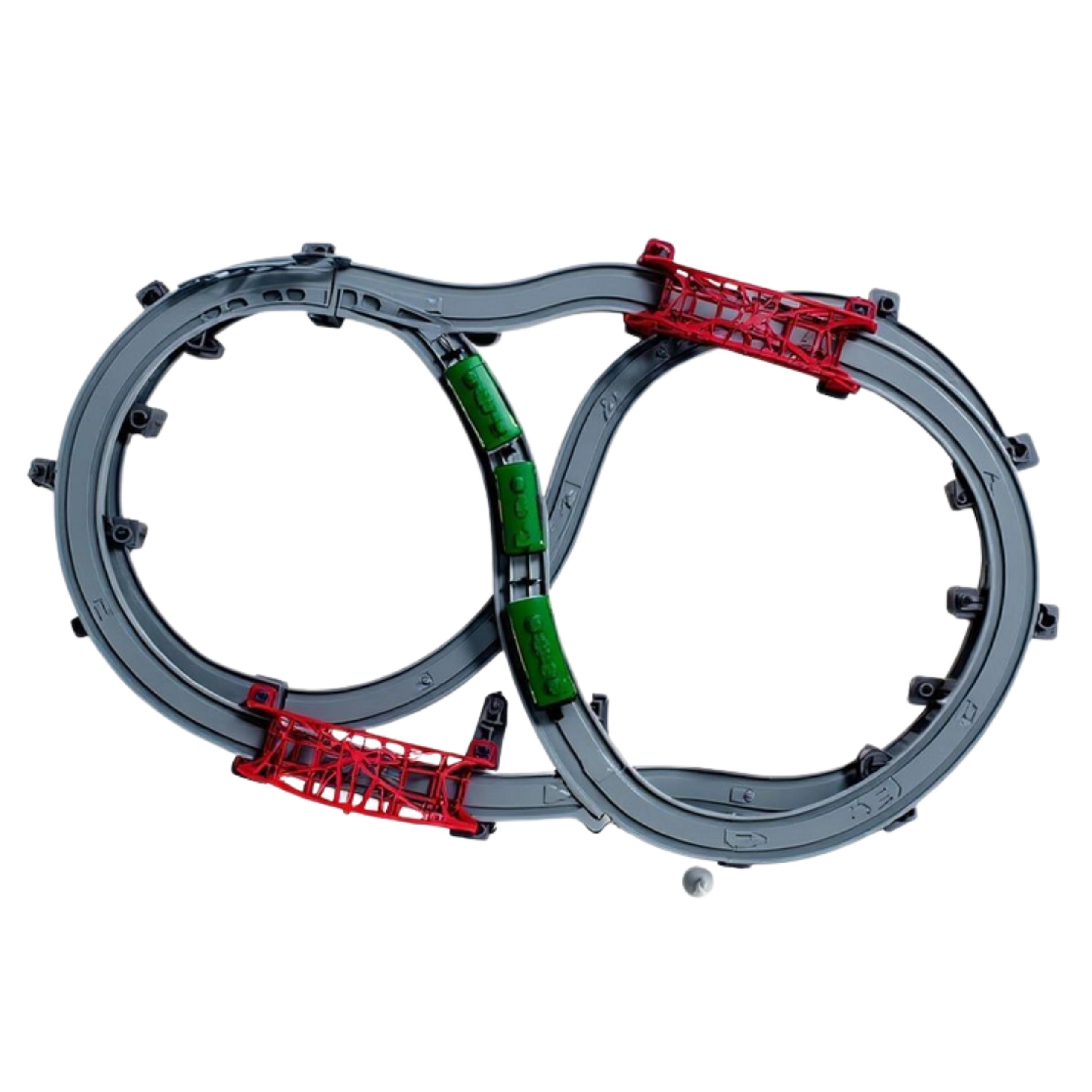 - lokomotyva, 2 vagonai, tiesūs ir lenkti bėgiai, tiltai, estakadės, bėgių perjungikliai, figūrėlės, kelio ženklai, medžiai, pastatai, instrukcija
