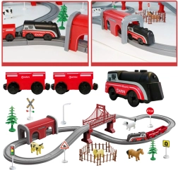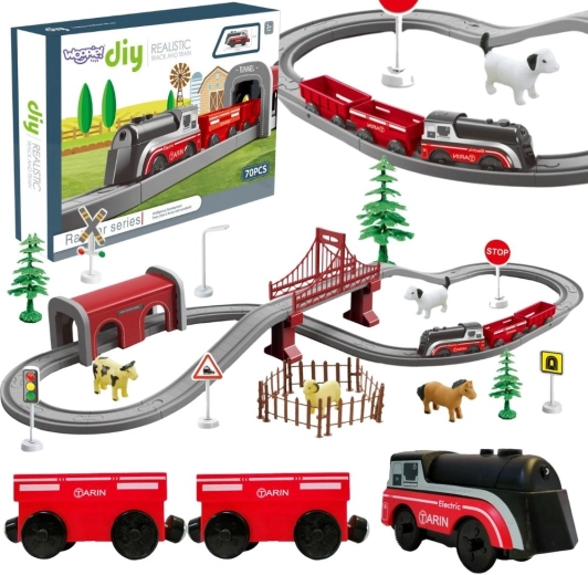 Leiskitės į vaizdingą kelionę po ūkį su elektrine WOOPIE traukinio trasa iš gausaus rinkinio – net 70 dalių. Elektrinis lokomotyvas, magnetiniai vagonai bei tunelis ir tiltas pavers kiekvieną žaidimą tikrovišku nuotykiu. Vaikai kurs savo scenas pasitelkdami gyvūnėlius, kelio ženklus ir dekoracijas, taip lavindami vaizduotę, logiką ir smulkiąją motoriką.