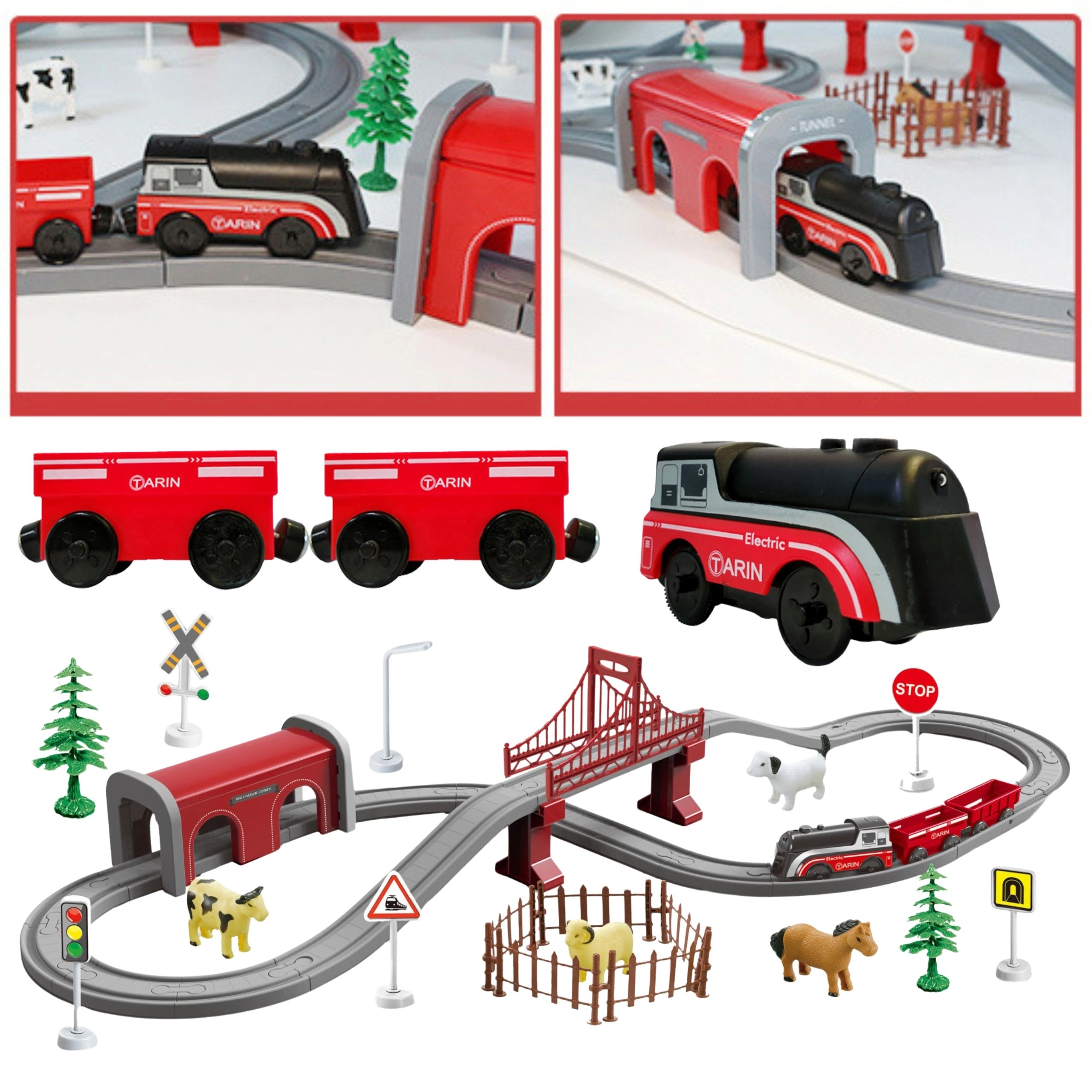 - Elektrinis lokomotyvas, 2 krovininiai vagonai su magnetiniais sukabinimais, 20 bėgių dalių, 13 jungčių, 2 tilto atramos, 3 tilto dalys, 5 tunelio dalys, 5 kelio ženklai, 1 šviestuvo stulpas, 6 stovai, 2 medžiai, arklio, šuns, avino ir karvės figūrėlės, 5 tvoros, lipdukai, trasų pasiūlymų instrukcija