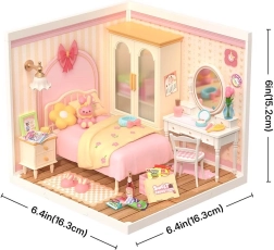 Šis nuostabus pastelinių tonų mini miegamasis suteikia viską, ką vertina miniatiūrų mėgėjai: lovą su tekstile, tualetinį staliuką su veidrodžiu, naktinį staliuką, įmontuotą spintą ir daugybę mažų aksesuarų. Šiltas LED apšvietimas kuria jaukią atmosferą ir pabrėžia detaliai apdirbtus baldus bei dekoracijas.