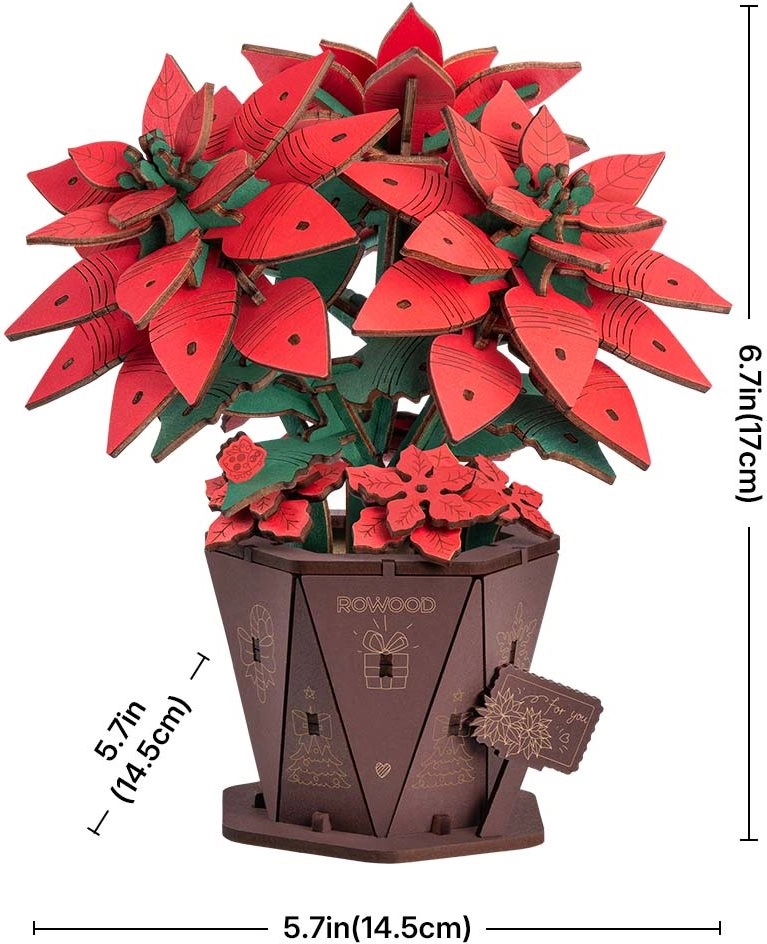 Ši elegantiška 3D medinė kalėdinė žvaigždė vazonėlyje sudaryta iš lazeriu išpjautų detalių, kurios sunumeruotos greitam ir intuityviam surinkimui. Dėl tvirtos konstrukcijos išlaiko formą, o surinkus sukuria įspūdingą šventinę puošmeną su realistiškais lapais ir žiedlapiais.