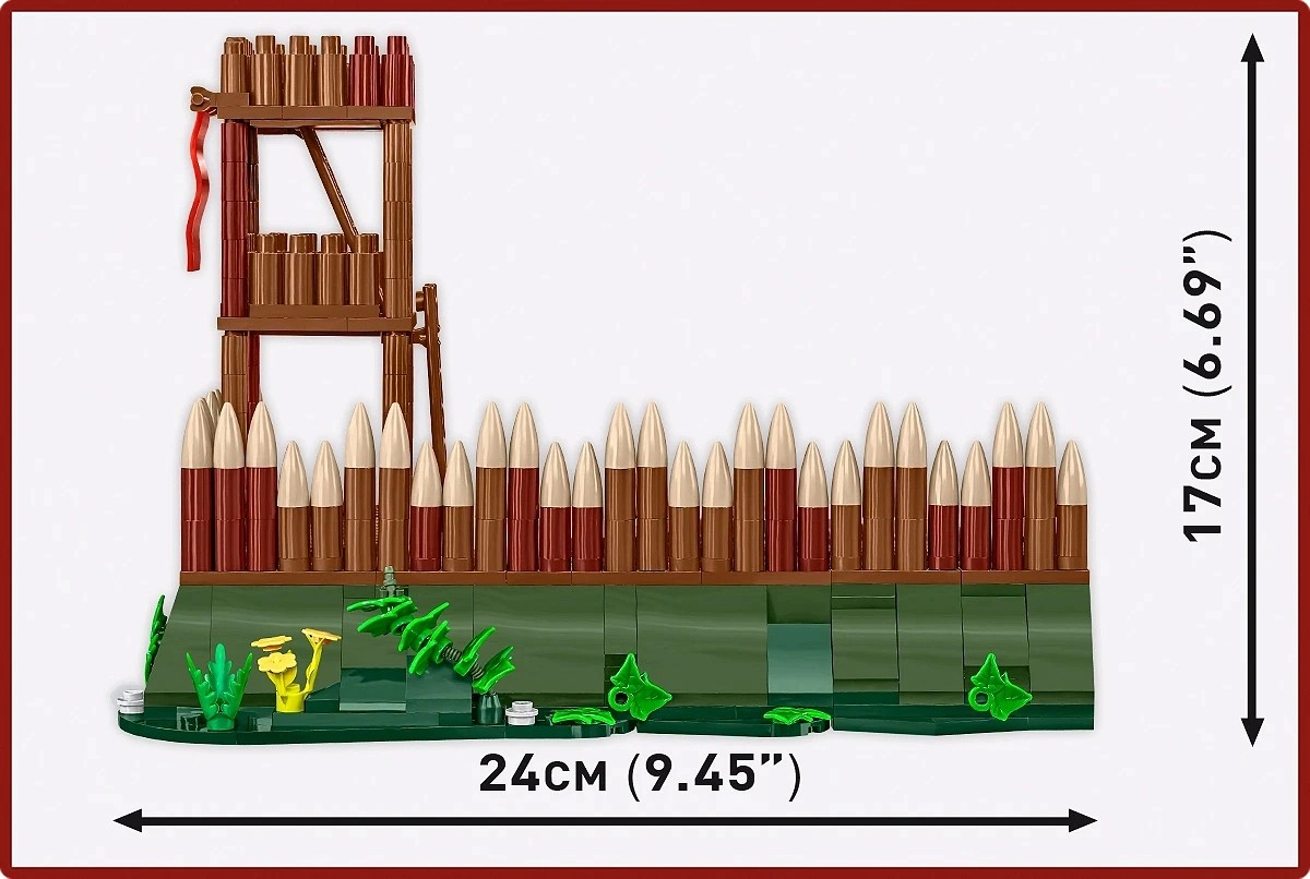- 628 detalės – tikslus suderinimas ir tvirta bokšto su palisada konstrukcija.