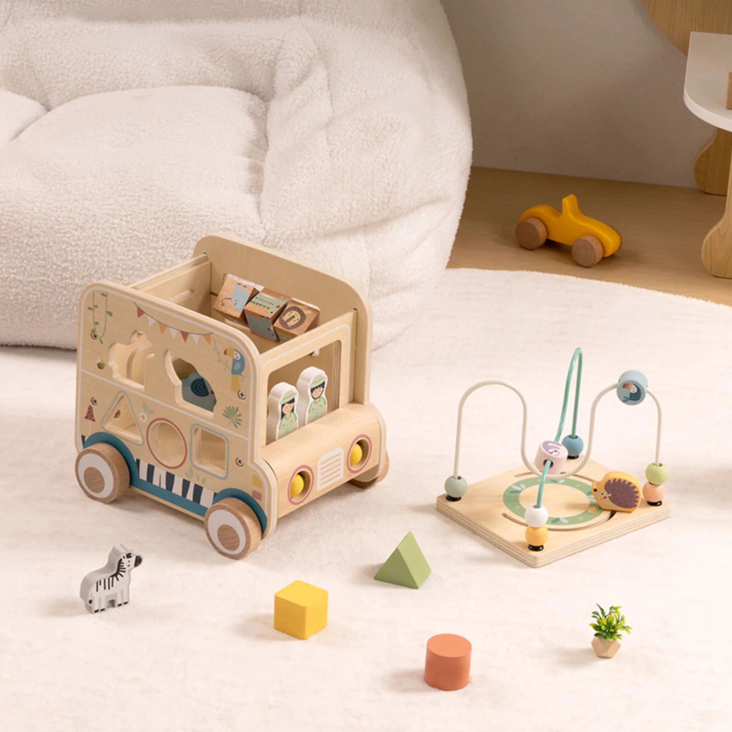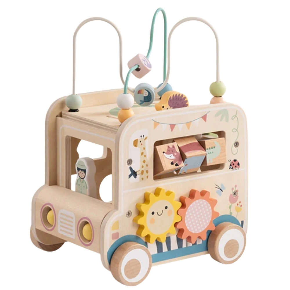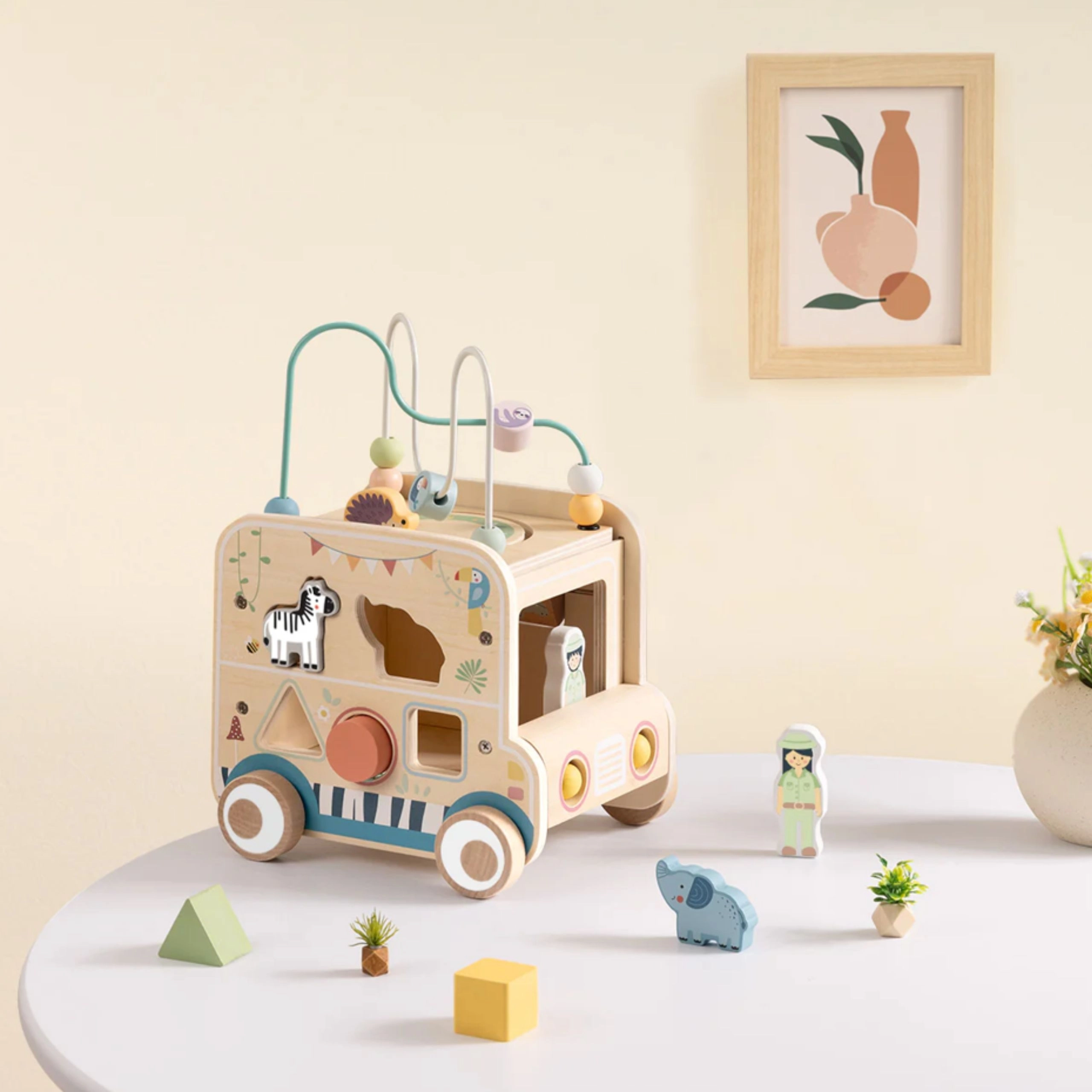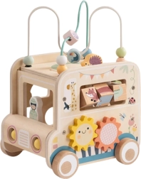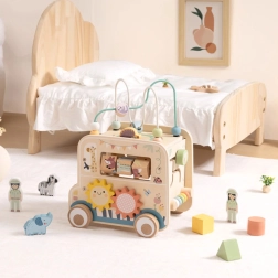 Medinė aktyvioji kaladė/safari automobilis suteikia vaikams begalę atradimų galimybių. Nuo nuimamos motorikos kilpos su karoliukais, per labirintą ir krumpliaračius iki besisukančių kaladėlių su gyvūnais – kiekviena pusė siūlo naują iššūkį. Švelnių spalvų dizainas ir glotnus apdirbimas užtikrina saugų žaidimą ir įgūdžių lavinimą.