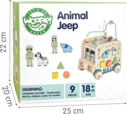 Atraskite žaismingą pasaulį su medine aktyviąja kalade, suformuota kaip safari automobilis, iš prekės ženklo WOOPIE GREEN. Šis daugiafunkcis žaislas apjungia motorinį labirintą, formų rūšiavimą, besisukančius krumpliaračius ir vaizdines kaladėles, kad lavintų smulkiąją motoriką, koordinaciją ir kūrybišką žaidimą vaikams nuo 18 mėnesių.