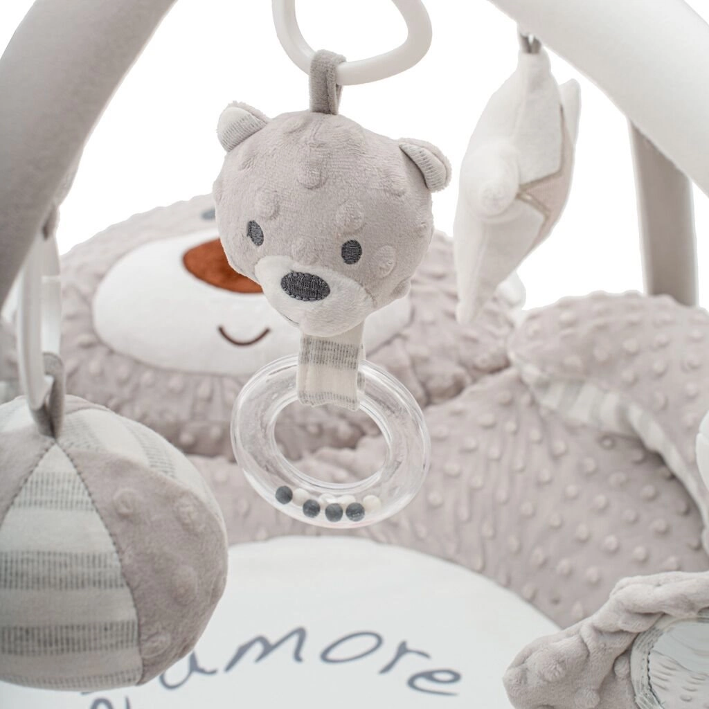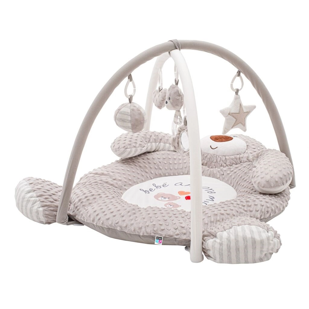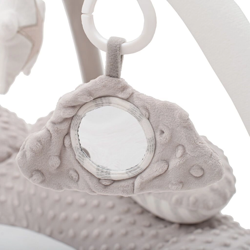 Ši prabangi žaidimų antklodė iš švelnios minky tkaninos su iškilimais sukuria jaukią ir saugią aplinką jūsų kūdikiui. Kontrastiniai raštai, įvairios tekstūros ir interaktyvūs elementai padeda vystyti regą, lytėjimą, koordinaciją ir smulkiąją motoriką. Integruota arka su nuimamais žaislais motyvuoja vaiką siekti, sugriebti ir verstis.