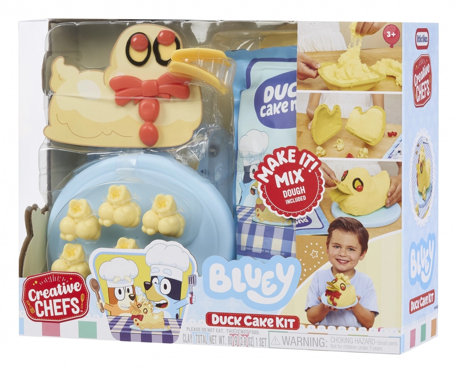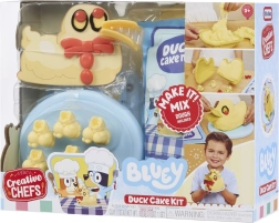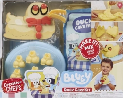 Rinkinys CREATIVE CHEFS BLUEY – tortas „Antytė“ suteikia vaikams valandų pramogų ir lavina jų vaizduotę. Sudėtyje yra 15 realistiškų virtuvės priedų, antytės formos kepimo forma ir formuojama masė Make It! Mix. Taip pat pridedamas vaizdinis receptas, kuris moko vaikus laikytis paprastų instrukcijų ir skatina kūrybišką žaidimą bei vaidmenų žaidimą.