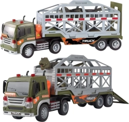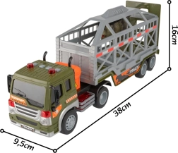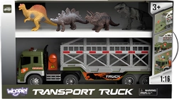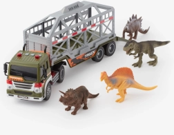 Šis detaliai sukurtas vilkikas su atjungiama puspriekabe suteikia vaikams tikroviškos veiksmo ir nuotykių. Dėka frikcinės pavaros pastūmus važiuoja į priekį, o šviesos ir garsai (variklis, signalas, atbulinė eiga, sirena) dar labiau sustiprina žaidimo įspūdį. Narvas su nuleidžiamu trapu leidžia lengvai pakrauti ir iškrauti dinozaurus.