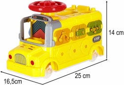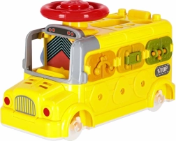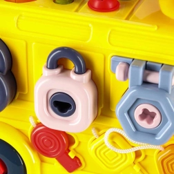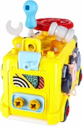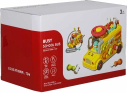 Interaktyvus autobusas vienija transporto priemonę ir mini dirbtuvę. Vaikai gali važinėti, sukti varžtus, bandyti spynas su raktais, sukti vairą ir tyrinėti „variklį“ po atverčiamu dangčiu. Įvairios užduotys natūraliai lavina smulkiąją motoriką, kantrybę ir problemų sprendimą.