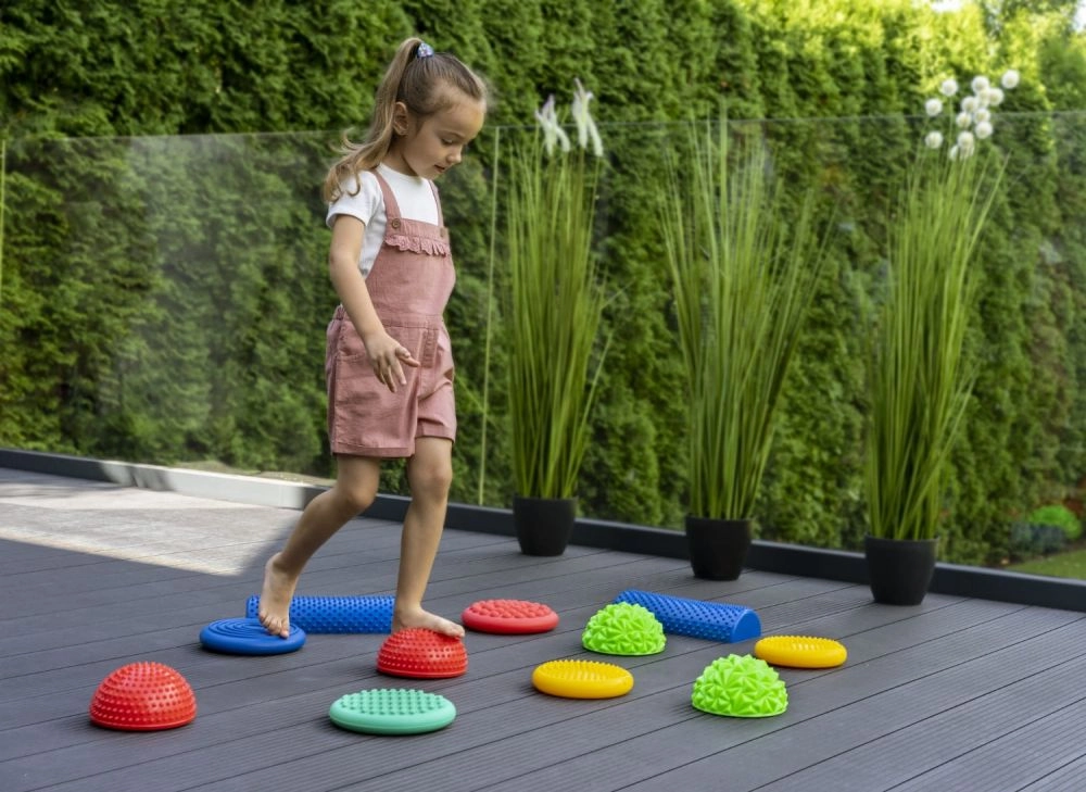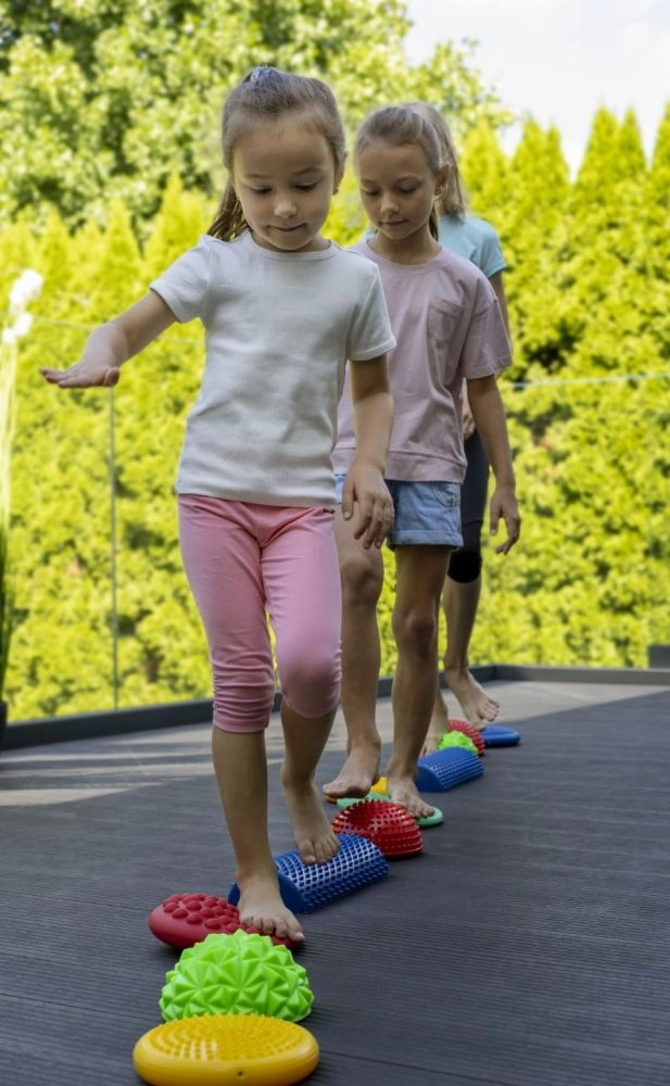 Sukurkite namuose ar mokykloje linksmą judėjimo trasą iš 11 elementų rinkinio pusiausvyrai, koordinacijai ir jutiminiam suvokimui lavinti. Skirtingos formos ir paviršiai su iškilimais suteikia taktilinę stimulaciją, skatina mokymąsi žaidžiant ir užtikrina neslystantį bei saugų treniravimąsi basomis ar su kojinėmis. Idealu vaikams, kineziterapijai ir sensorinei integracijai.