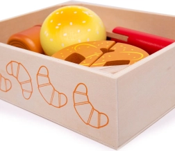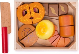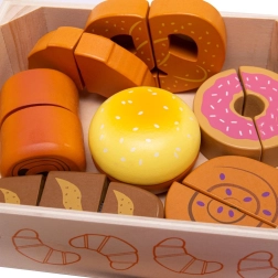 Kiekvienas kepinys sujungtas lipnia juostele (velkro) ir gali būti pjaustomas mediniu peiliu realistiškam žaidimui.