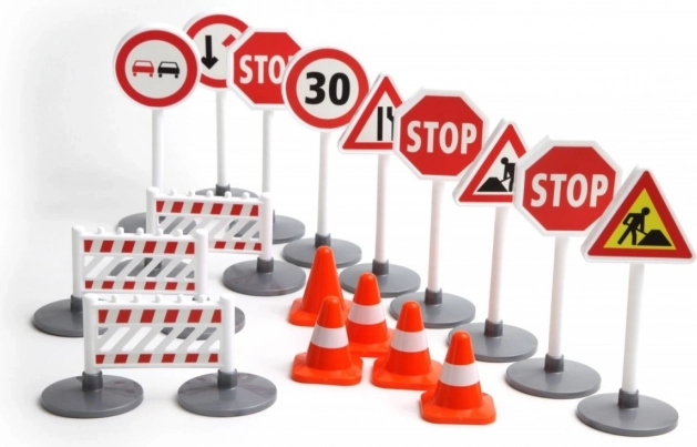 Visas pagrindinių ženklų rinkinys (STOP, greičio ribojimas, kelio darbai ir kt.) smagiam kelių eismo taisyklių mokymuisi.