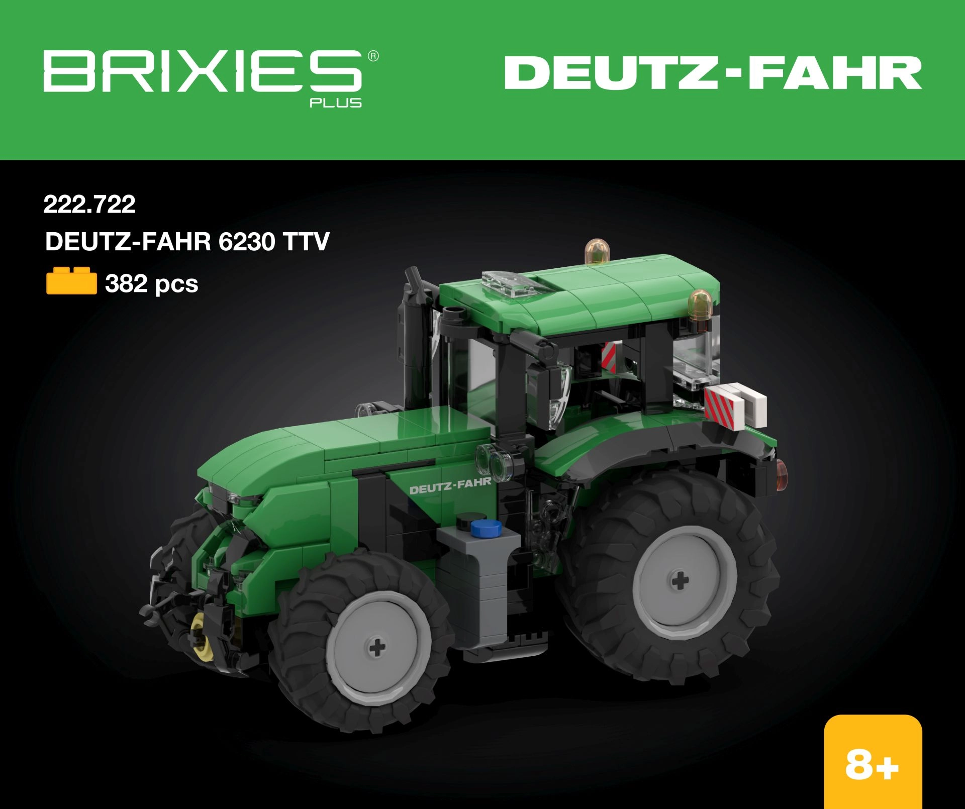 Sukonstruokite ikoninį traktorių DEUTZ-FAHR 6230 TTV iš 3D konstruktoriaus BRIXIES Plus su 382 detalėmis. Maždaug 17,7 × 10,2 × 9,1 cm modelis tiksliai atkuria tikrojo įrenginio dizainą ir pradžiugins tiek vaikus, tiek suaugusiuosius. Didesnės kaladėlės iš patvaraus ABS plastiko yra suderinamos su panašiais konstruktoriais, rinkinyje yra instrukcija, o prekės ženklas suteikia 5 metų garantiją atsarginėms dalims.