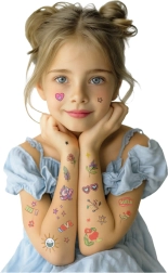 Linksmame laikinųjų tatuiruočių vaikams rinkinyje yra net 60 skirtingų raštų – širdelės, žvaigždutės, gėlės, mėnuliai ir kiti pasakiški motyvai. Tatuiruotes lengva užklijuoti, jos yra saugios vaikų odai ir laikosi 3–5 dienas. Lengvai nusiplauna muilu ir šiltu vandeniu, idealiai tinka šventėms, gimtadieniams ar teminiams žaidimams.