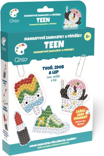 Paverskite idėjas spindinčiomis dekoracijomis! ARTO kūrybinis rinkinys leidžia vaikams lengvai kurti originalius pakabukus ir lipdukus. Tereikia vadovautis šablonu, klijuoti mažus „deimantus“ į pažymėtas vietas ir netrukus atsiras ryškūs kūriniai, kurie papuoš kuprinę, penalą arba taps miela dovana.